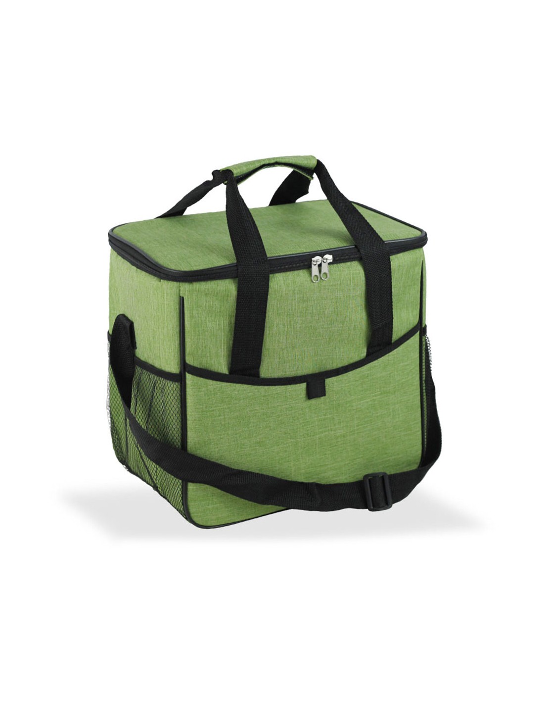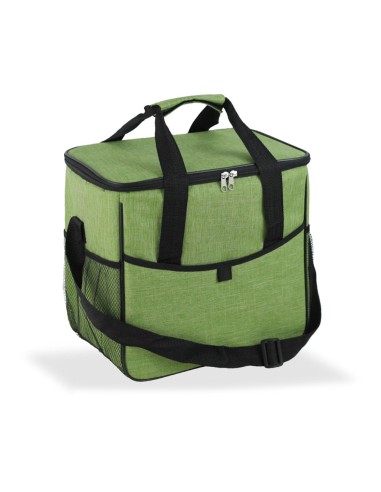 Nevera diseño tejana, color verde, 21 l. con bolsillo frontal, asas y correa ajustable, con aislamiento de capa de alu film y plástico protector, revestimiento con isotérmico epe de 5 mm. medidas: 31,7 x 20 x 33 cm