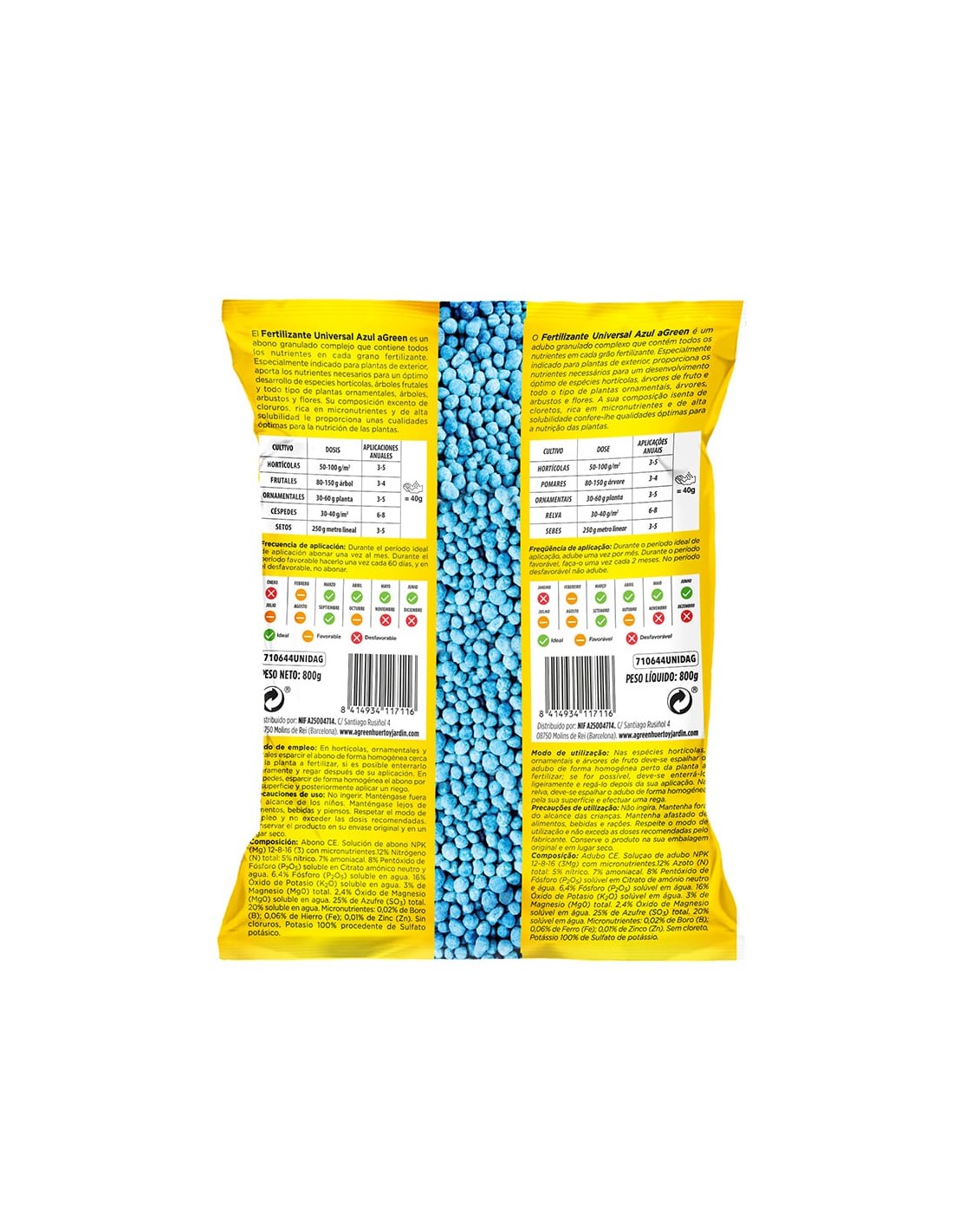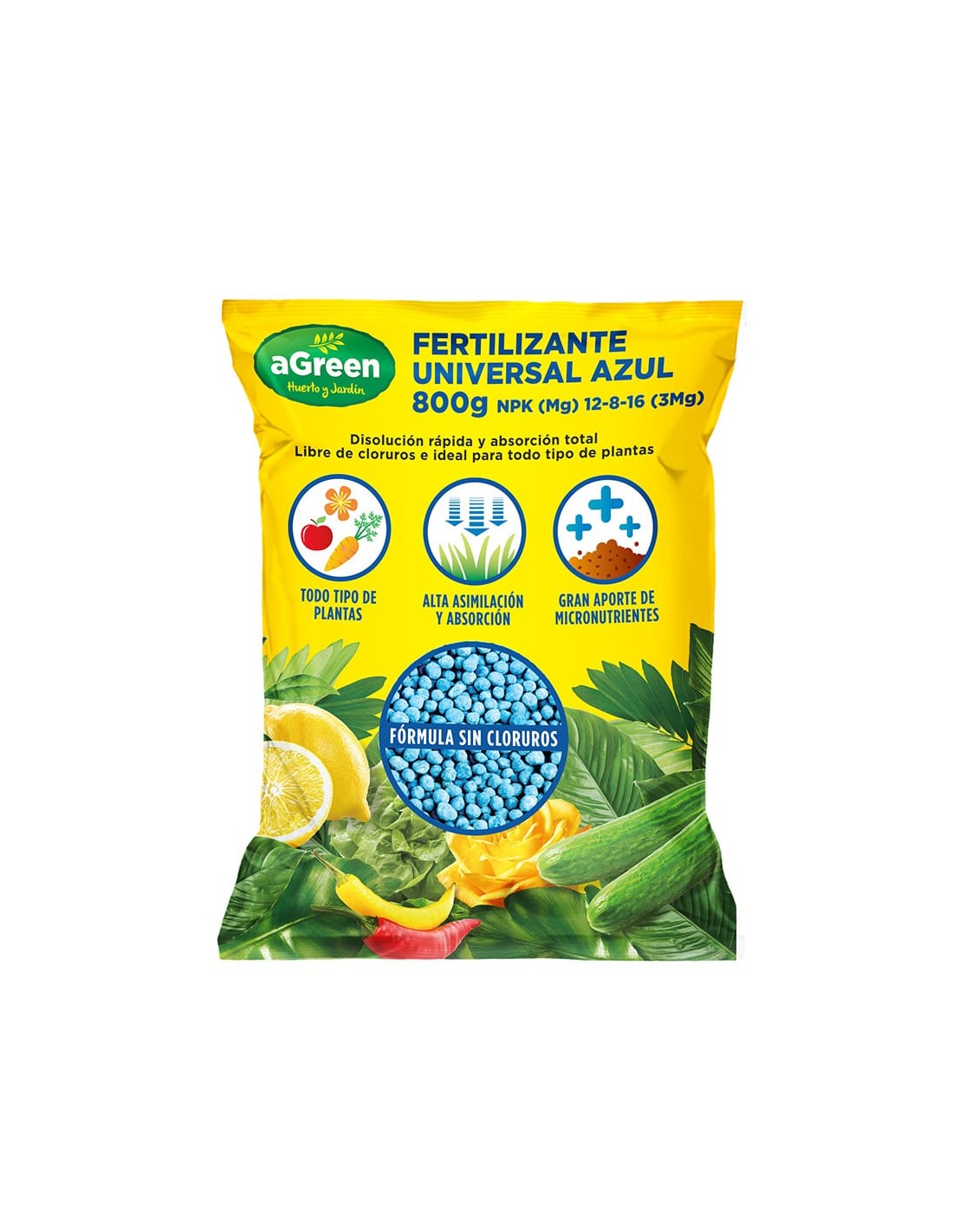 Fertilizante universal azul 800 g indicado para plantas de exterior, aporta los nutrientes necesarios para un óptimo desarrollo de especies hortícolas, árboles frutales y todo tipo de plantas ornamentales, árboles, arbustos y flores. composición exenta de cloruros, rica en micronutrientes y de alta solubilidad le proporciona unas cualidades óptimas para la nutrición de las plantas