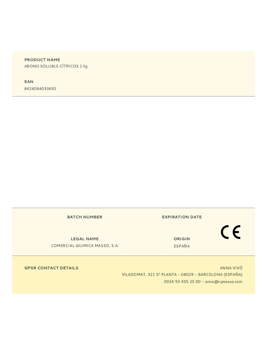 Abono soluble cítrico es revitalizante y reverdeciente. potencia la floración y fructificación. aumenta la resistencia del árbol frente a los fríos invernales y enfermedades.abono inorgánico sólido compuesto a base de macronutrientes - n.p.k. (mg, so3) 11 - 8 - 12 (8,33). diluir en el agua de riego. dosificación: en suelo: 2-4 cucharadas/10 l de agua (dependiendo de la edad y la altura del árbol), en maceta: 1 cucharada/10 l de agua. periodo de aplicación: marzo a septiembre
