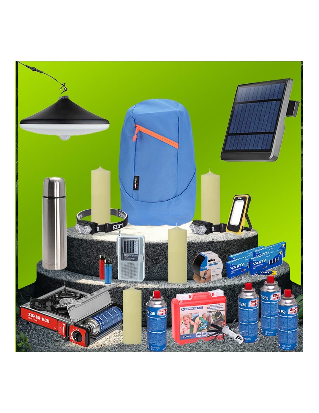 Kit de supervivencia compuesto por: 51117 radio portatil 9 bandas 31839 lampara solar 36126 linterna led solar 2 x 36123 linterna frontal 2 x 38596 10 pilas aaa varta 2 x 38597 10 pilas aa varta 73783 cocina portatil gas 4 x 90900 cartucho gas 227gr 47150 cinta americana negra 08557 multiherramienta 99734 kit primeros auxilios 4 x 36265 vela blanca 2 x 08096 encendedor 76653 termo acero inox 1 l y 02438 mochila 9 l