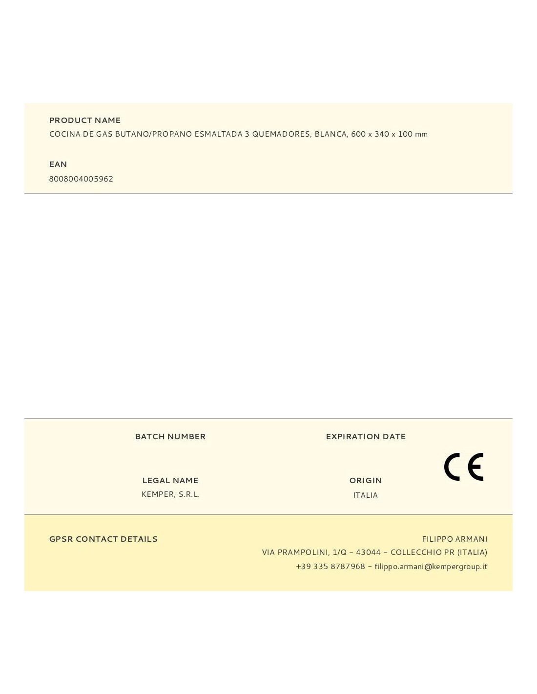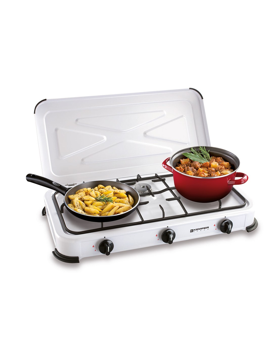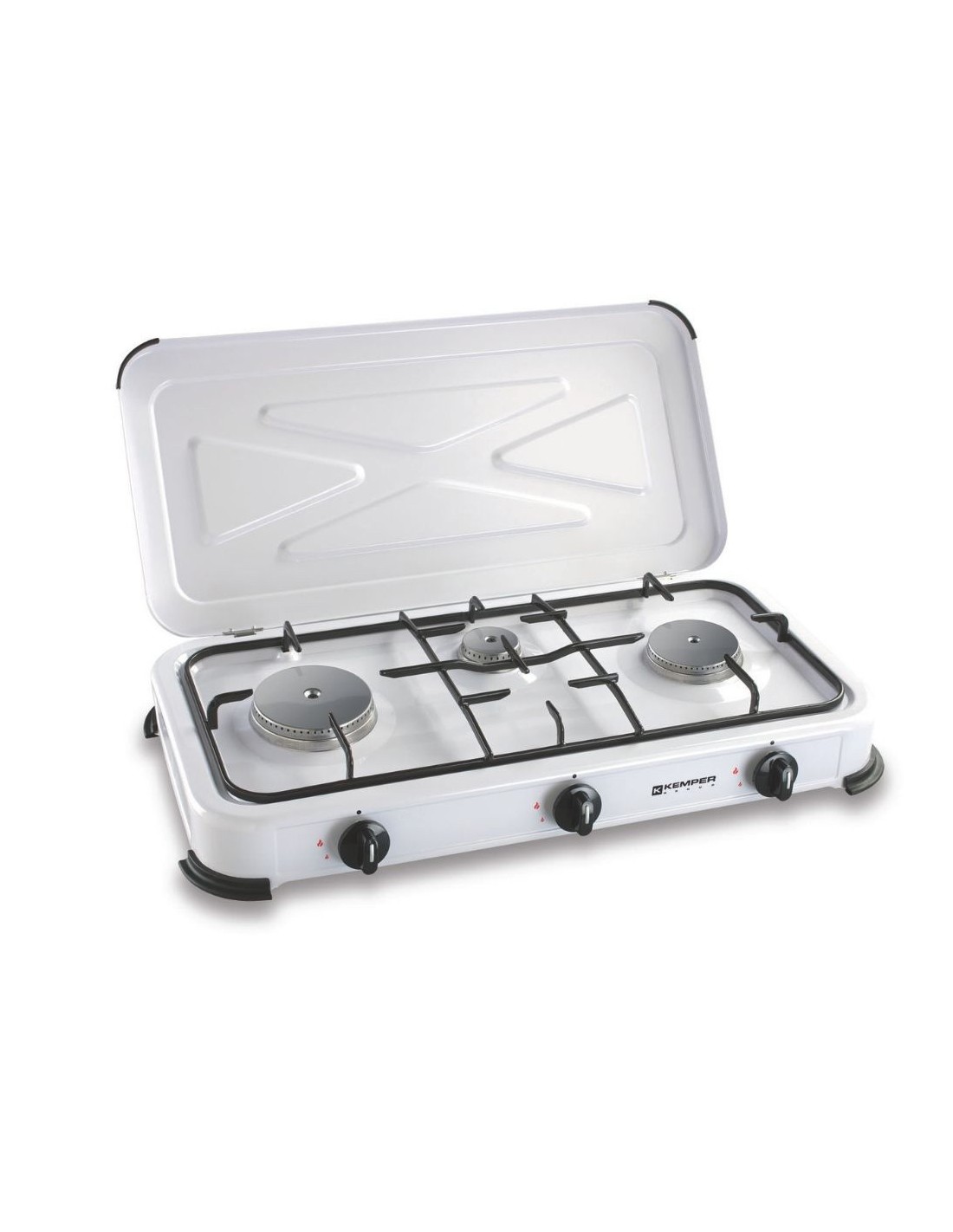 Cocina de gas butano/propano con tres quemadores, de acero inoxidable, de alta potencia. estable y robusta, con tapa y parrilla extraíble para una limpieza óptima soporte giratorio para tubo, cubrepatas de plástico antideslizantes el quemador está firmemente fijado para facilitar su transporte color blanco potencia: 1,4/1,2/0,85 kw 600 x 340 x 100 mm