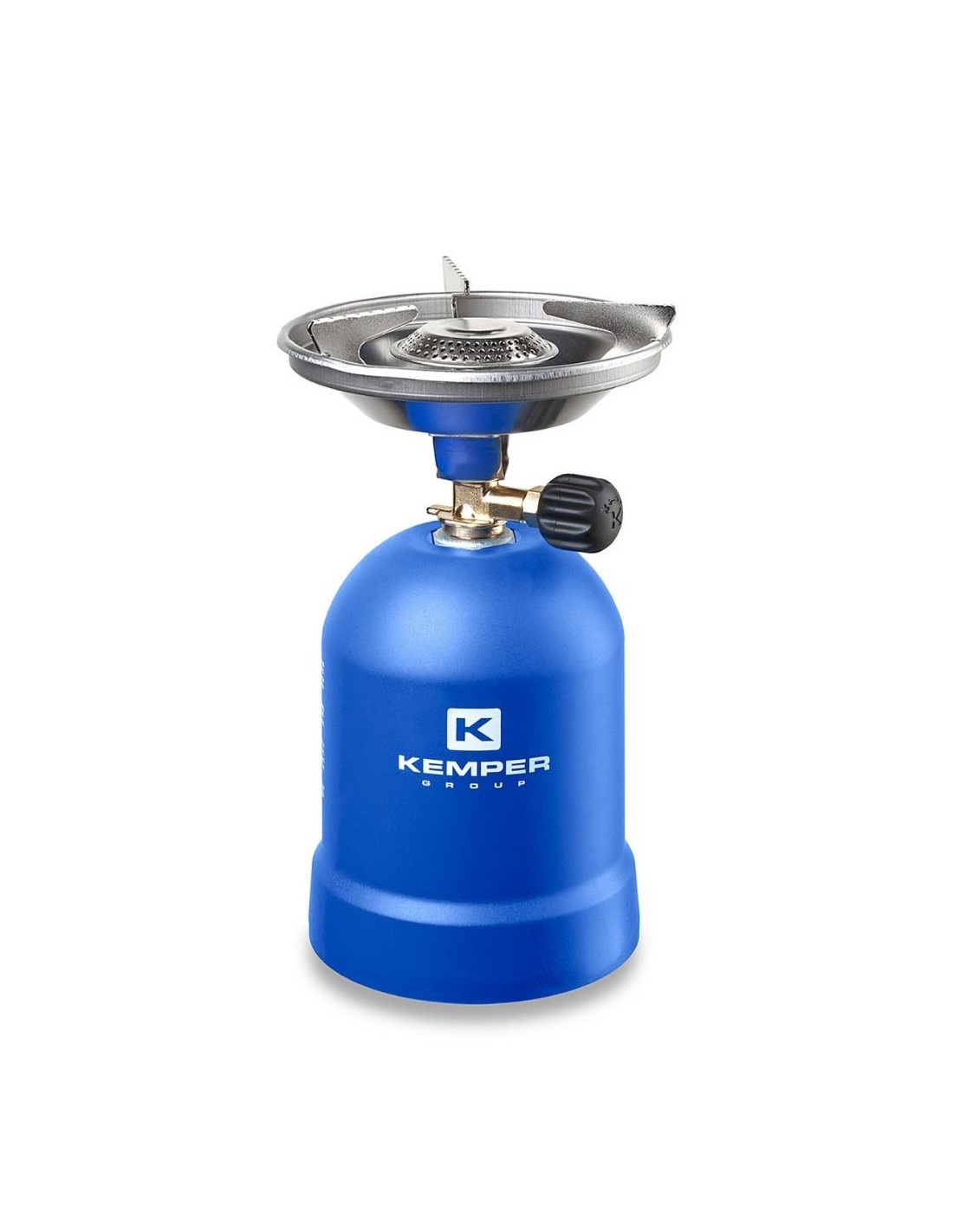 Hornillo portatil para cartucho 190 g, con plato anti viento, base en plastico termo resistente, sistema de seguridad patentado anti desbloqueo del cartucho, alta eficiencia gracias al efecto deflector del plato anti viento 160 g/h 2,2 kw 125 x 125 x 215 mm