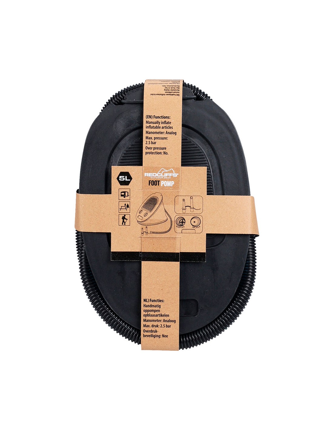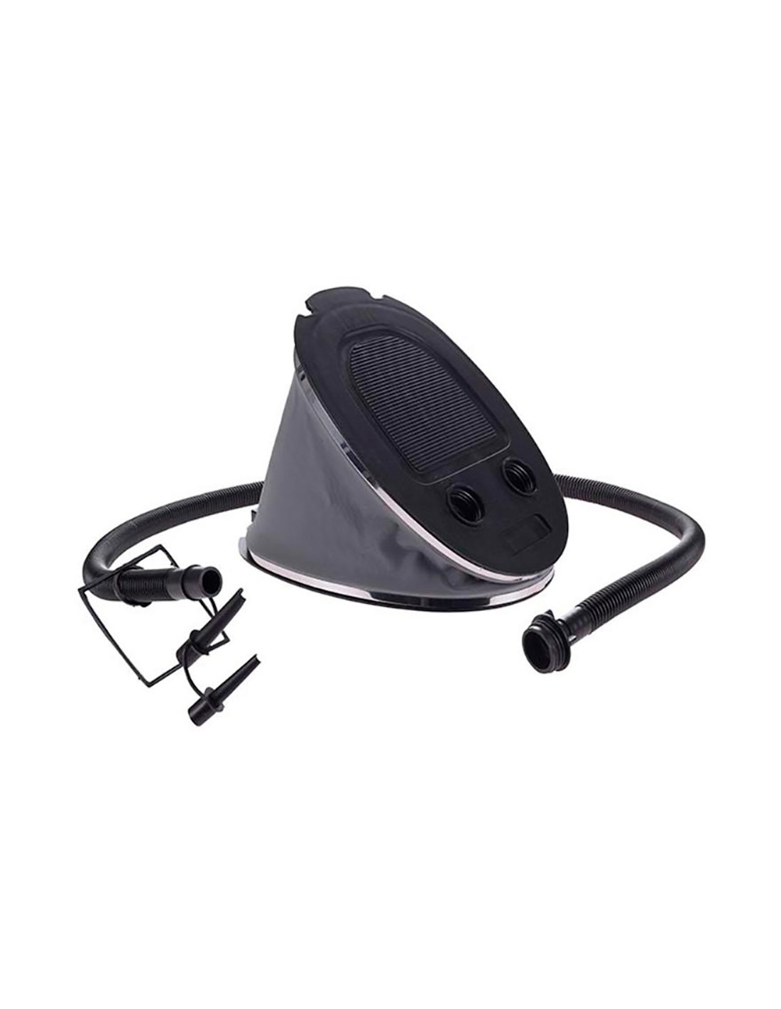 Bomba de aire de pie, 5 l, presión máxima 2,5 bar, material: pv y pp, todas las piezas de pp en color negro, interior gris con bordes metálicos plateados, con boquillas adicionales adaptables a todo tipo de válvulas 265 x 185 mm