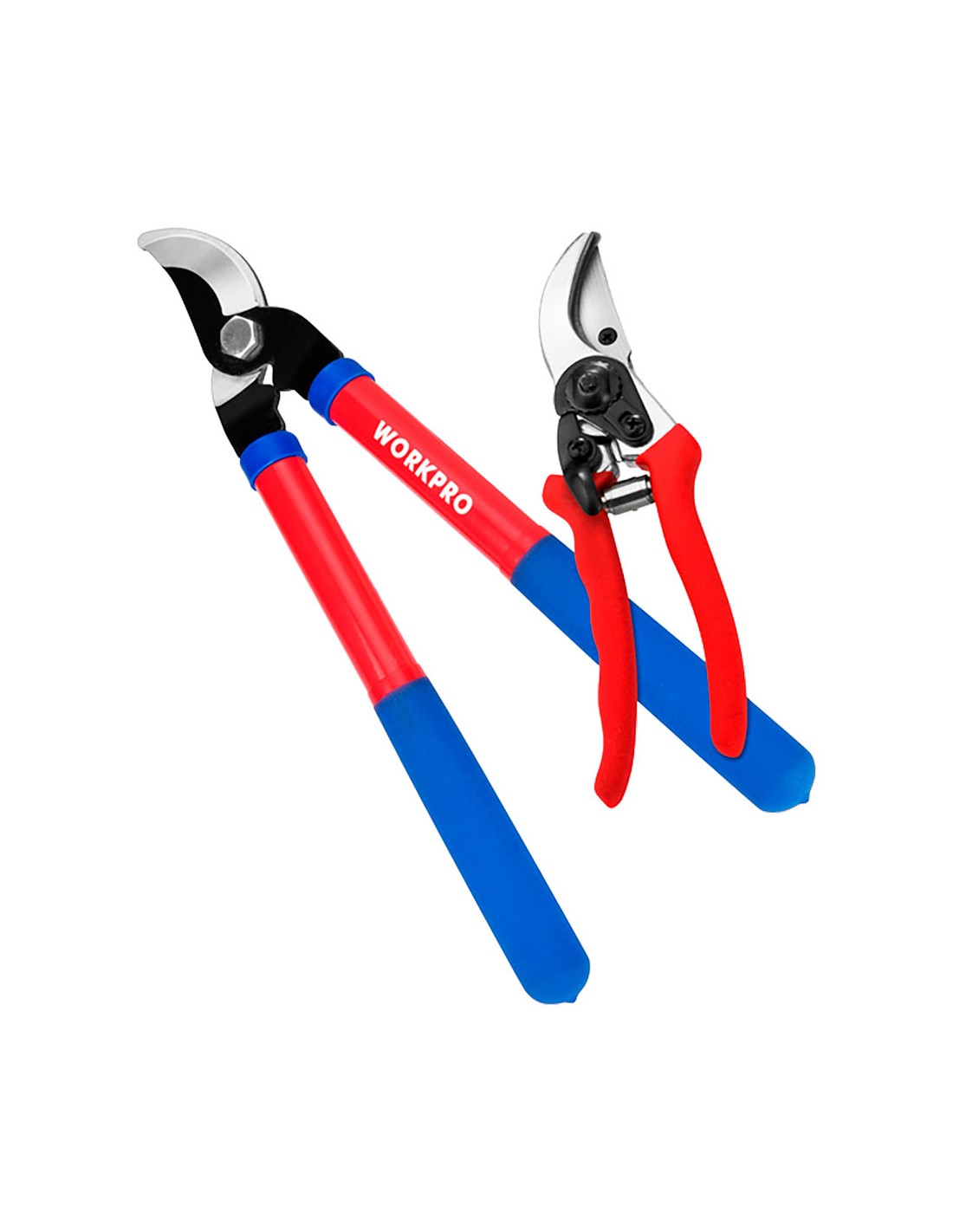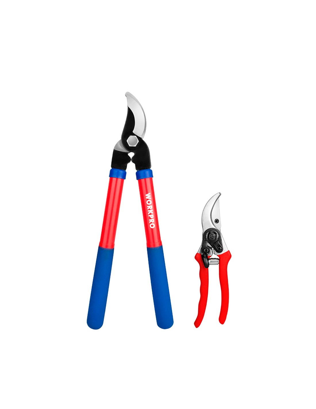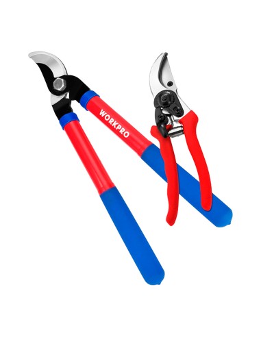 Herramientas de poda, juego 2 piezas cuchillas totalmente tratadas térmicamente para mayor rendimiento de corte incluye: 1 tijera podadora de dos manos de 380 mm con diámetro máximo de corte 15 mm, abertuta máxima 38 mm 1 tijera de podar de 200 mm con diámetro máximo de corte 10 mm, apertura máxima 30 mm