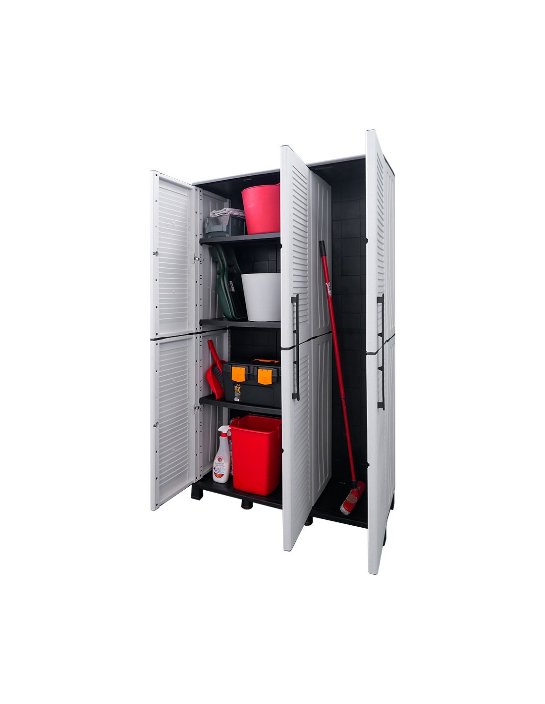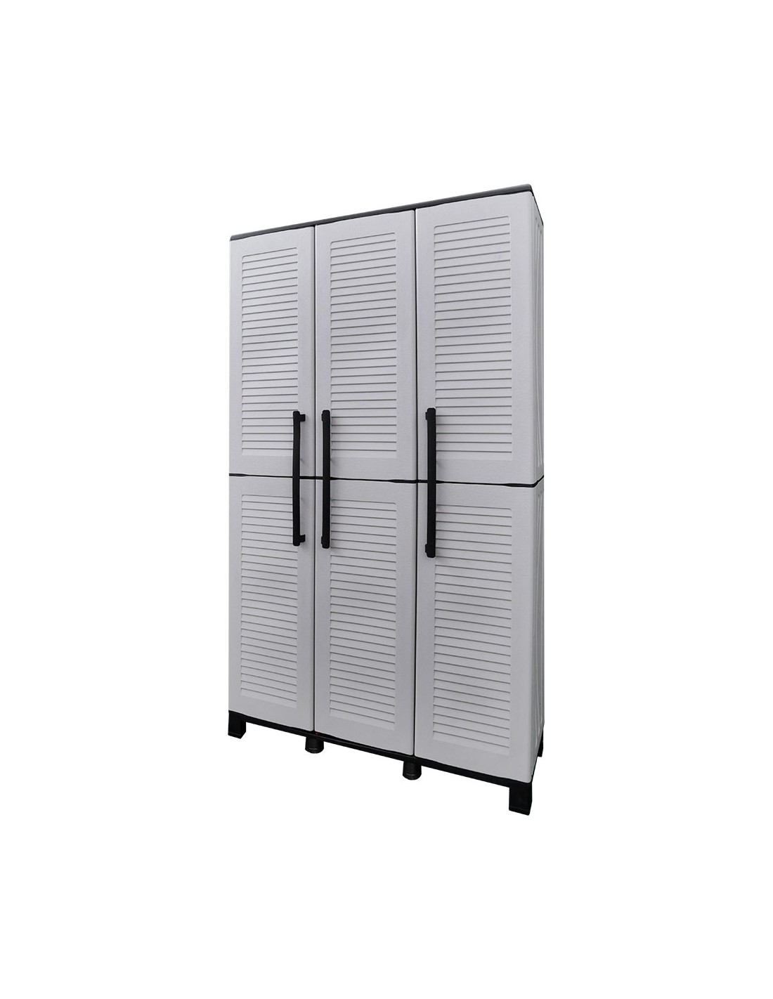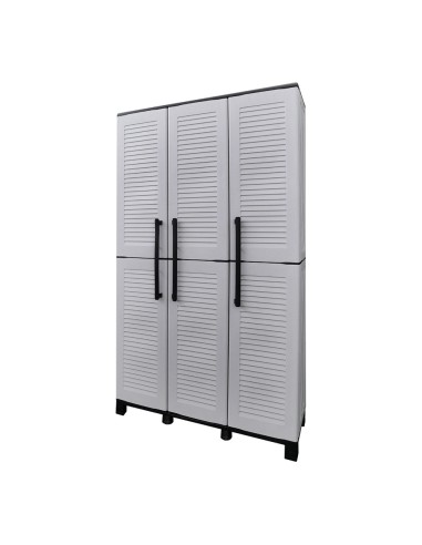Armario alto fabricado en polipropileno con patas, compartimento con estantes ajustables y portaescobas, material reciclable, equipado con bisagras de acero, estante interior regulable y patas, capacidad de carga de 20 kg por estante, gris, 102 x 37 x 169 cm