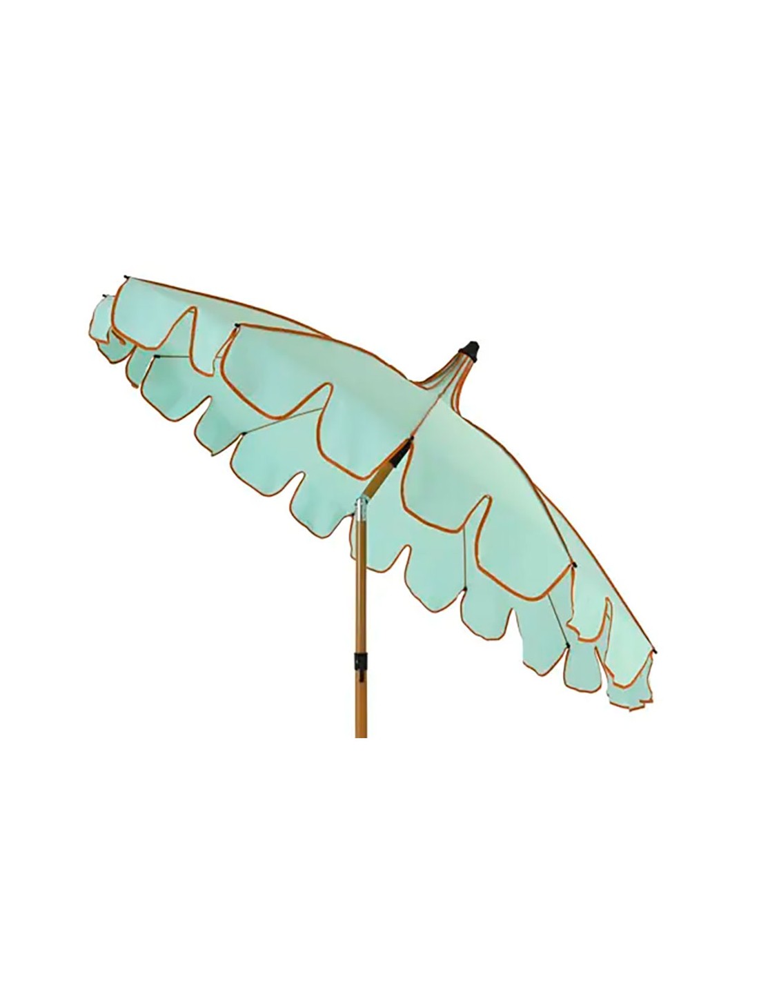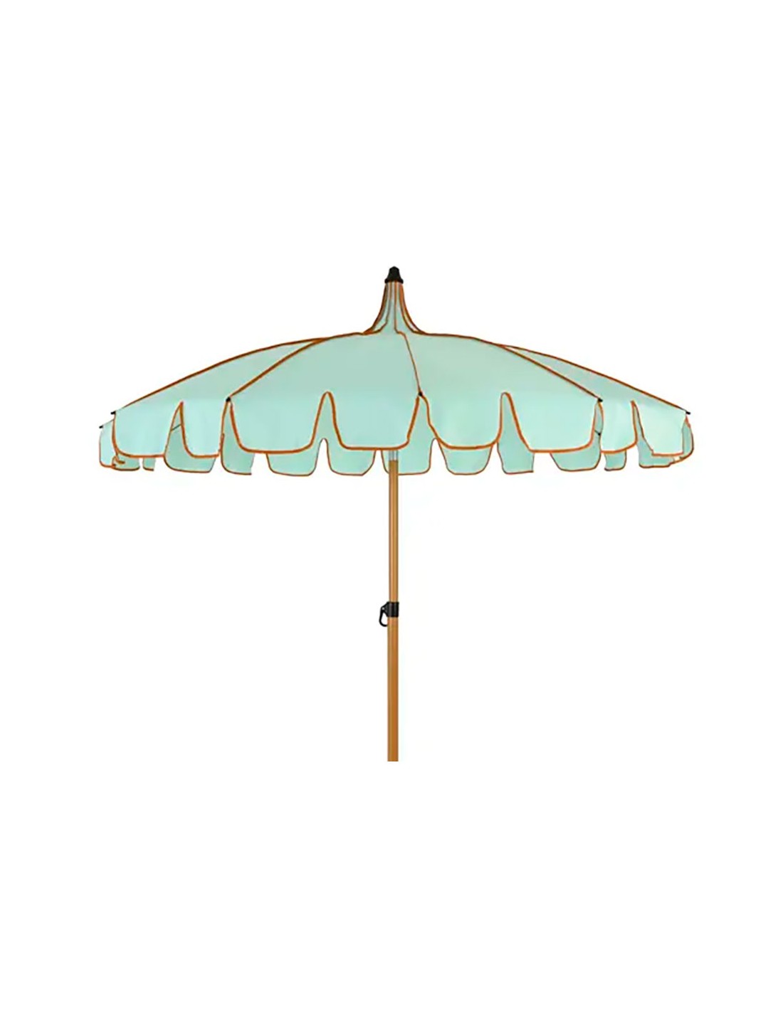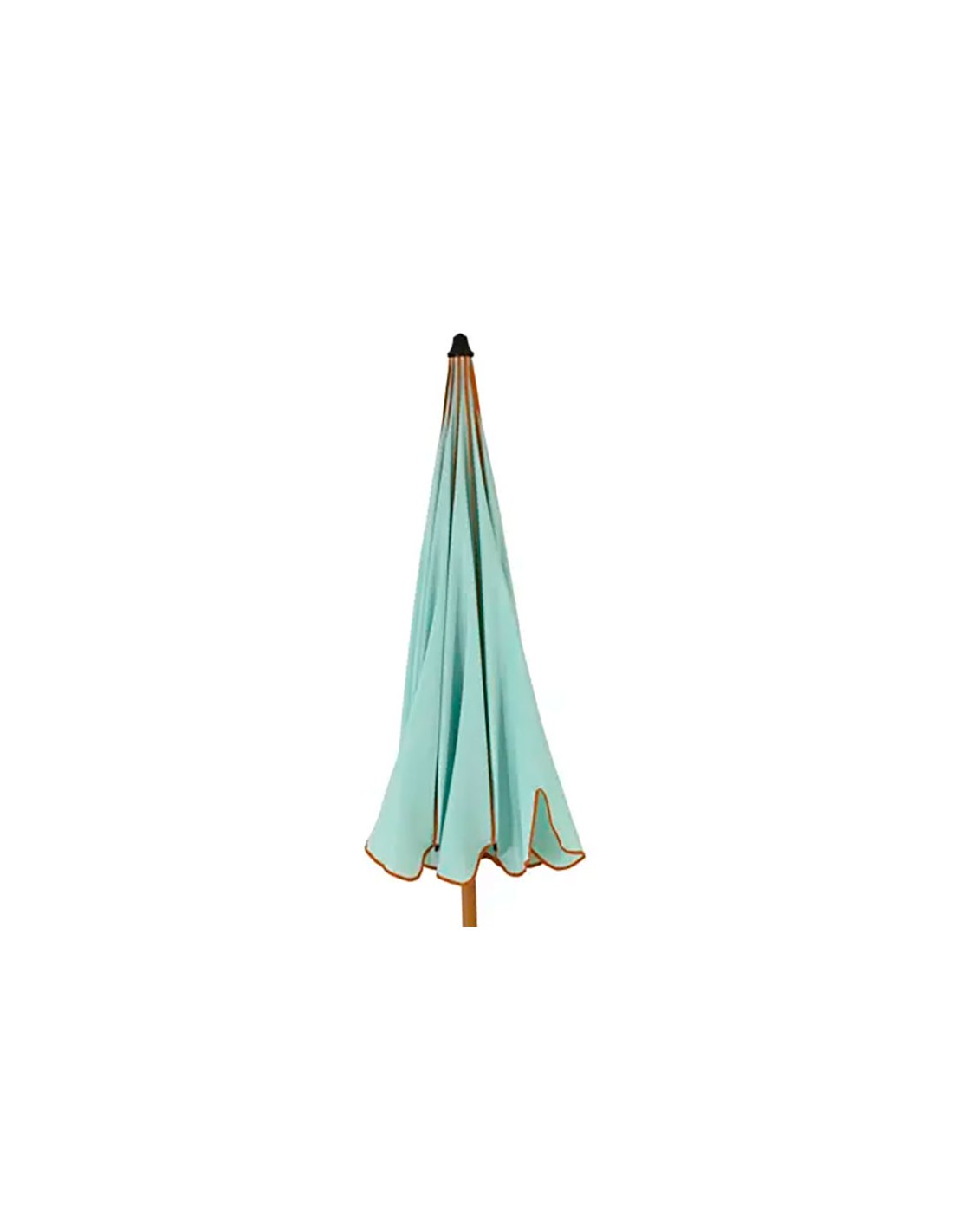 Sombrilla para jardín poliéster color azul turquesa ribete coral ajustable y plegable, protección uv 30, resistente al calor uv 400, repelente al agua. material acero, poliéster, nailon y plástico. estructura poster de acero de ø28 - 32 mm. dimensiones ø195 x 215 cm