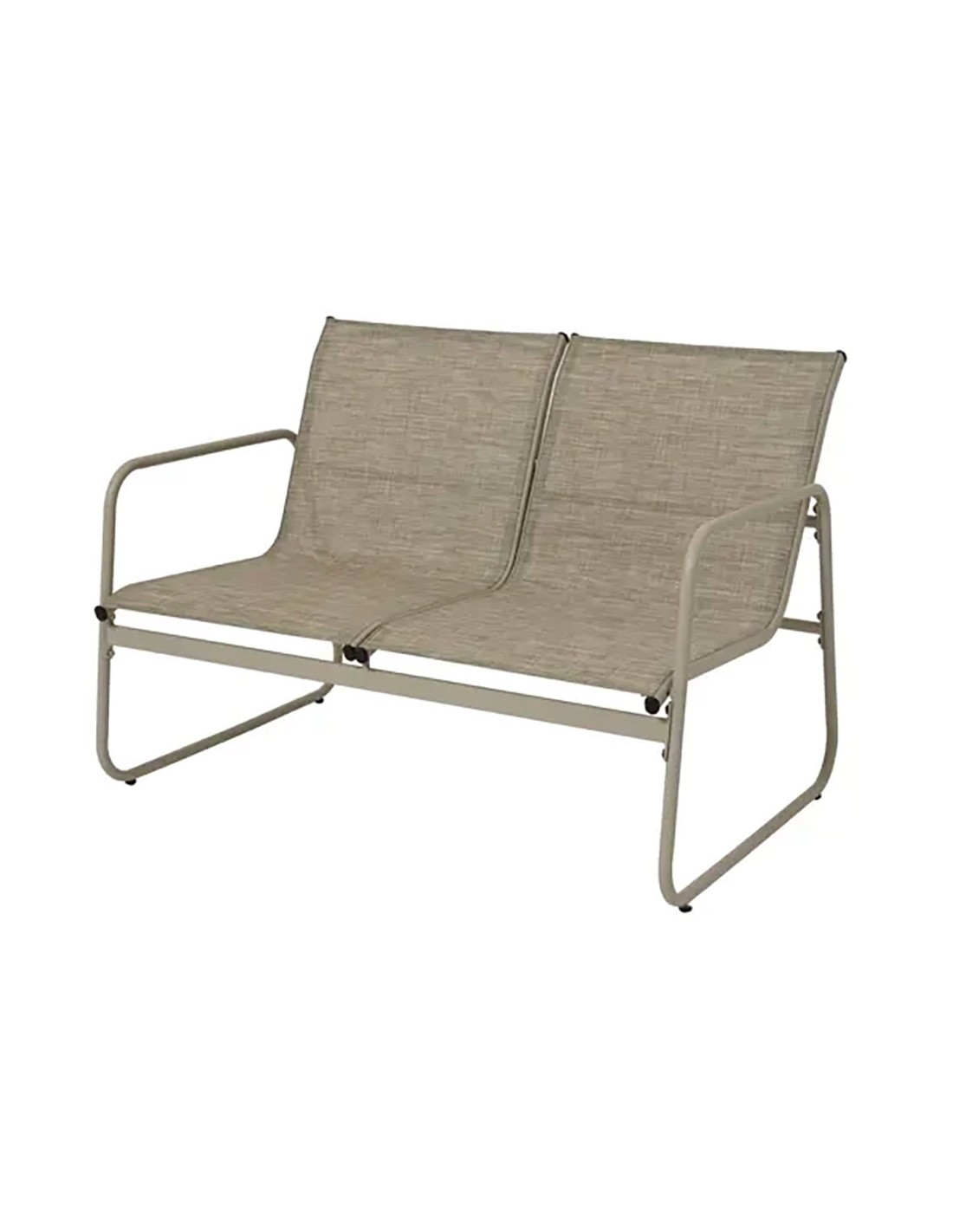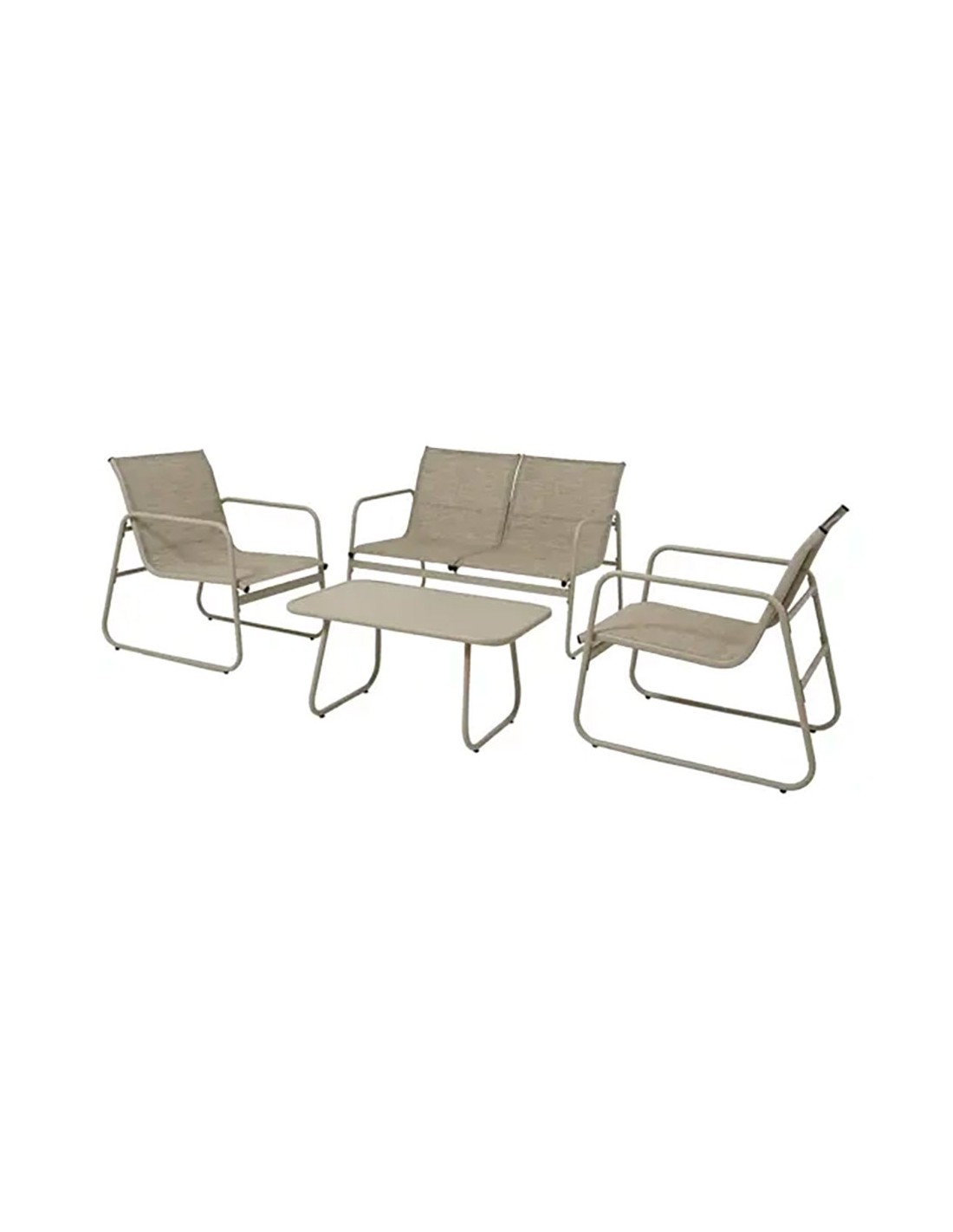 Conjunto de mesa, banco, 2 sillas, modelo bogota, beige. estructura de hierro, sillas y baco de textil. repele el agua. dimenisones: mesa 85 x 42 x 50 cm / banco 82 x 78,5 x 114 cm / silla 59 x 78,5 x 82 cm