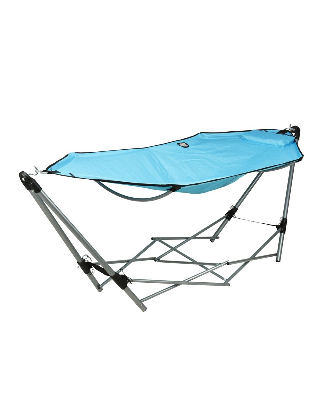 Hamaca plegable azul hecha de poliéster soporte de metal gris con tubos de ø32 mm, ø19 x y 16 mm carga máxima 120 kg incluye bolsa de transporte, dimensiones 240 x 80 x 75 cm
