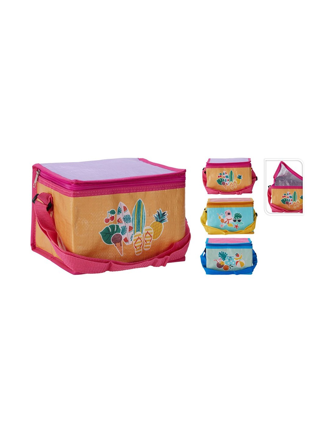 Nevera tipo bolsa de 4 l, fabricada en polipropileno con forro de aluminio de 2 mm, cierre de cremallera, con asa ajustable, modelos variados, 215 x 150 x 150 mm