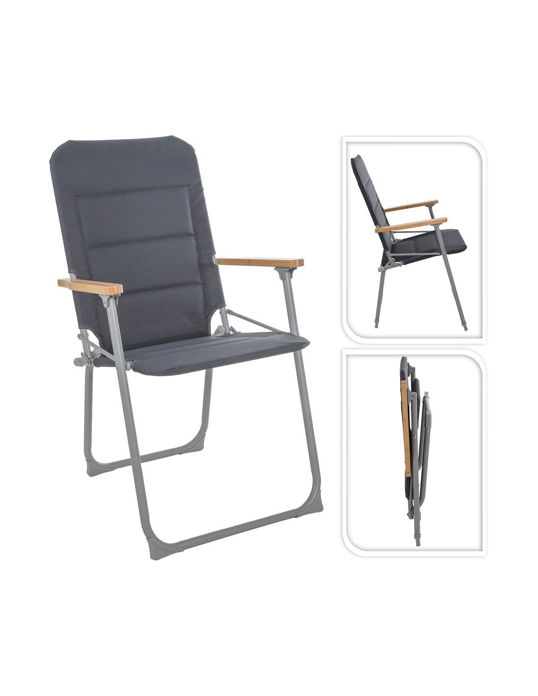 Silla de camping plegable, tejido de poliéster espumado color gris, estructura de metal con recubrimiento de polvo gris claro con tubos de ø22/19 mm, reposabrazos de bambú y con refuerzo en las patas de pp, dimensiones 52 x 55 x 92 cm