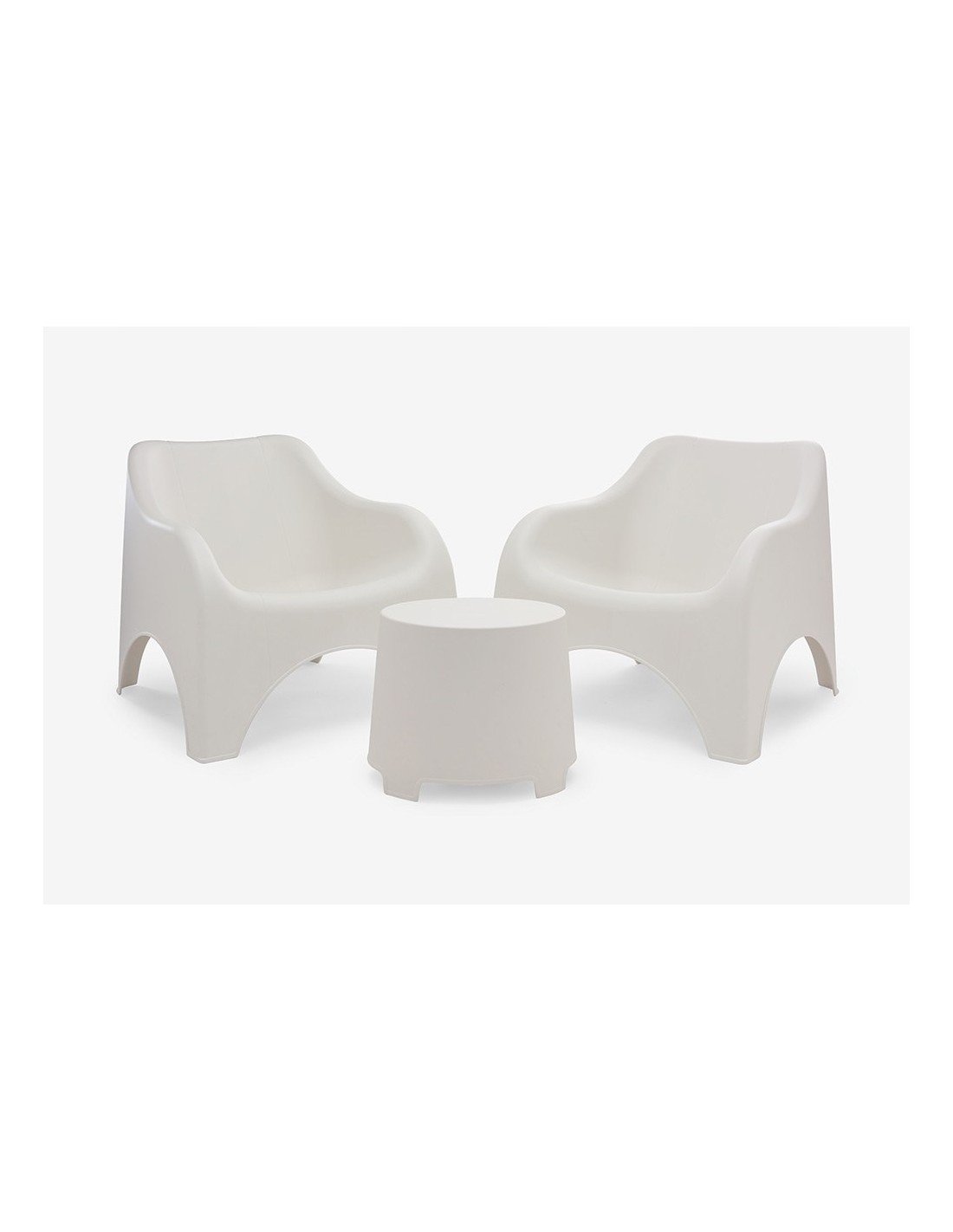 Conjunto de jardín y terraza, fabricado en polipropileno, compuesto por dos butacas, medidas: 79 x 79 x 69,5 cm - y una mesita, medidas: 46 x 40 x 38 cm, de fácil limpieza, color blanco