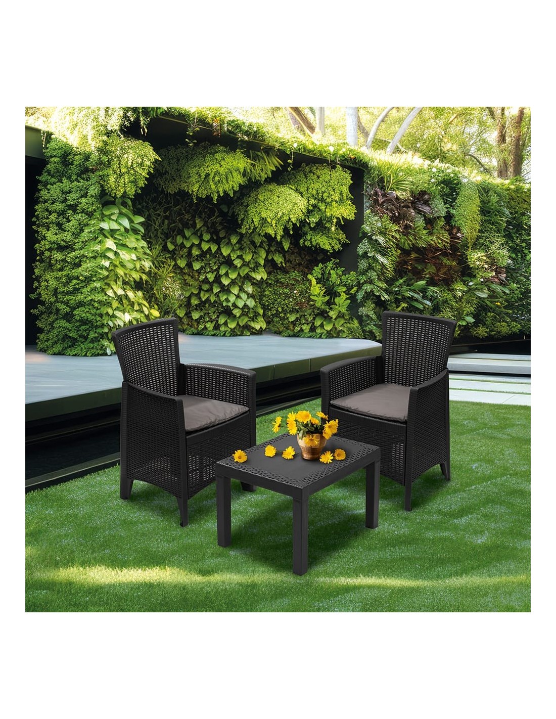 Conjunto de jardín y terraza, fabricado en polipropileno, efecto ratán, con cojines, compuesto por dos sillones, medidas: 59 x 57 x 85,5 cm - y una mesita, medidas: 59 x 46 x 40 cm - de fácil limpieza, color antracita