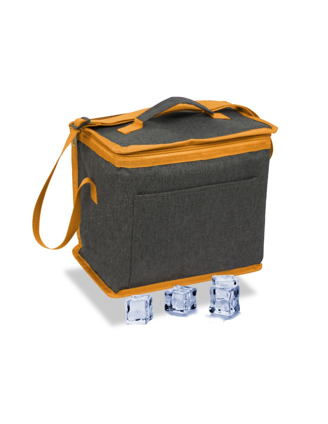 Nevera diseño tejana color gris, 10 l, con bolsillo frontal - con asa integrada a juego - ribete y correa ajustable en color naranja, con aislamiento de capa de alu film y plástico protector, revestimiento con isotérmico epe de 5 mm. medidas: 28 x 16 x 22 cm