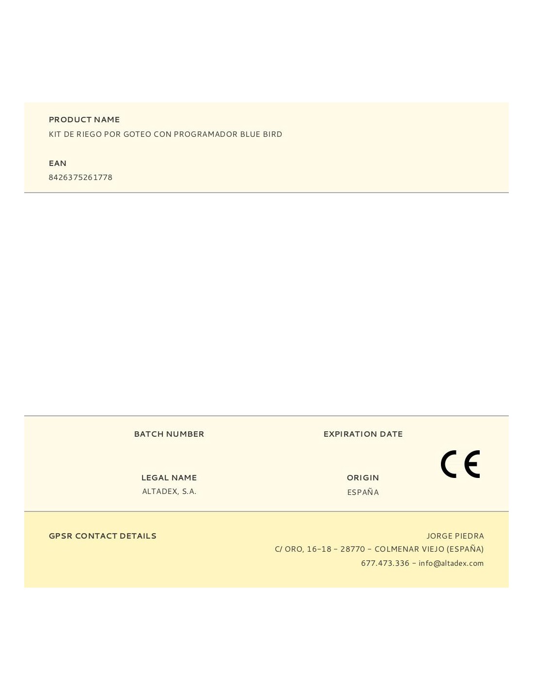 Kit de riego por goteo con programador blue bird 25m de tuberia de polietileno de 16mm. 15m de microtubo de 4mm. programador de grifo a1390. adaptador de grifo rosca hembra 3/4" 4mm. reductor de presión 3/4". filtro de anilla. 15 uniones de 4mm. 10 tapones de 4mm. 1 te de 16mm. 2 tapones de 16mm 15 piquetas soporte. 50 goteros desmontables 4 l/h. punzon. presión de trabajo 0.7-1.7 bar. permite el riego de hasta 50 plantas de forma autonoma. se puede ampliar en cualquier momento con cualquier producto adicional. ideales para regar huertos, flores, setos... el goteo ofrece mayor precisión de riego que una manguera o un aspersor y mucho menor consumo de agua. las plantas crecerán más saludables. reduce las malas hierbas de su alrededor.