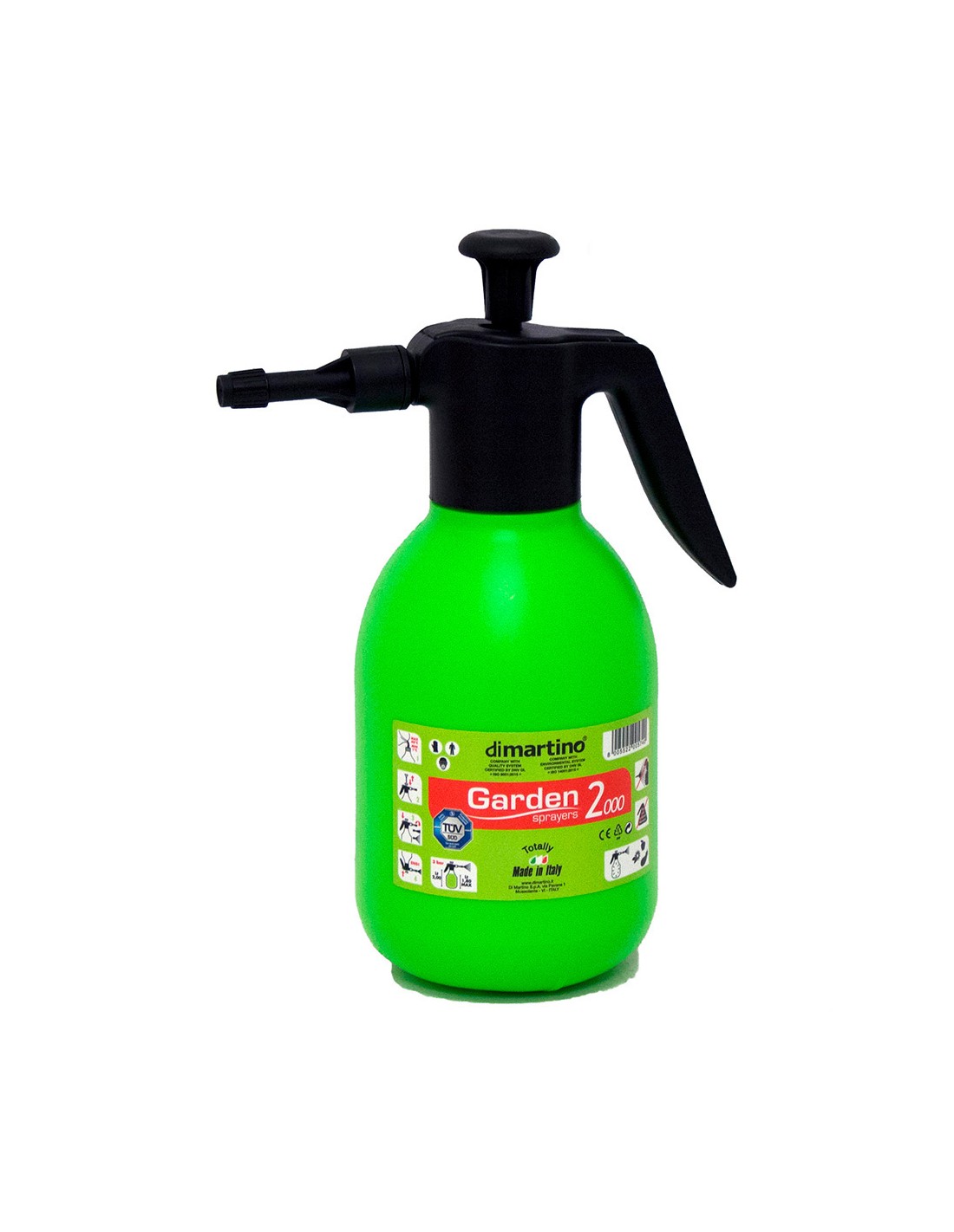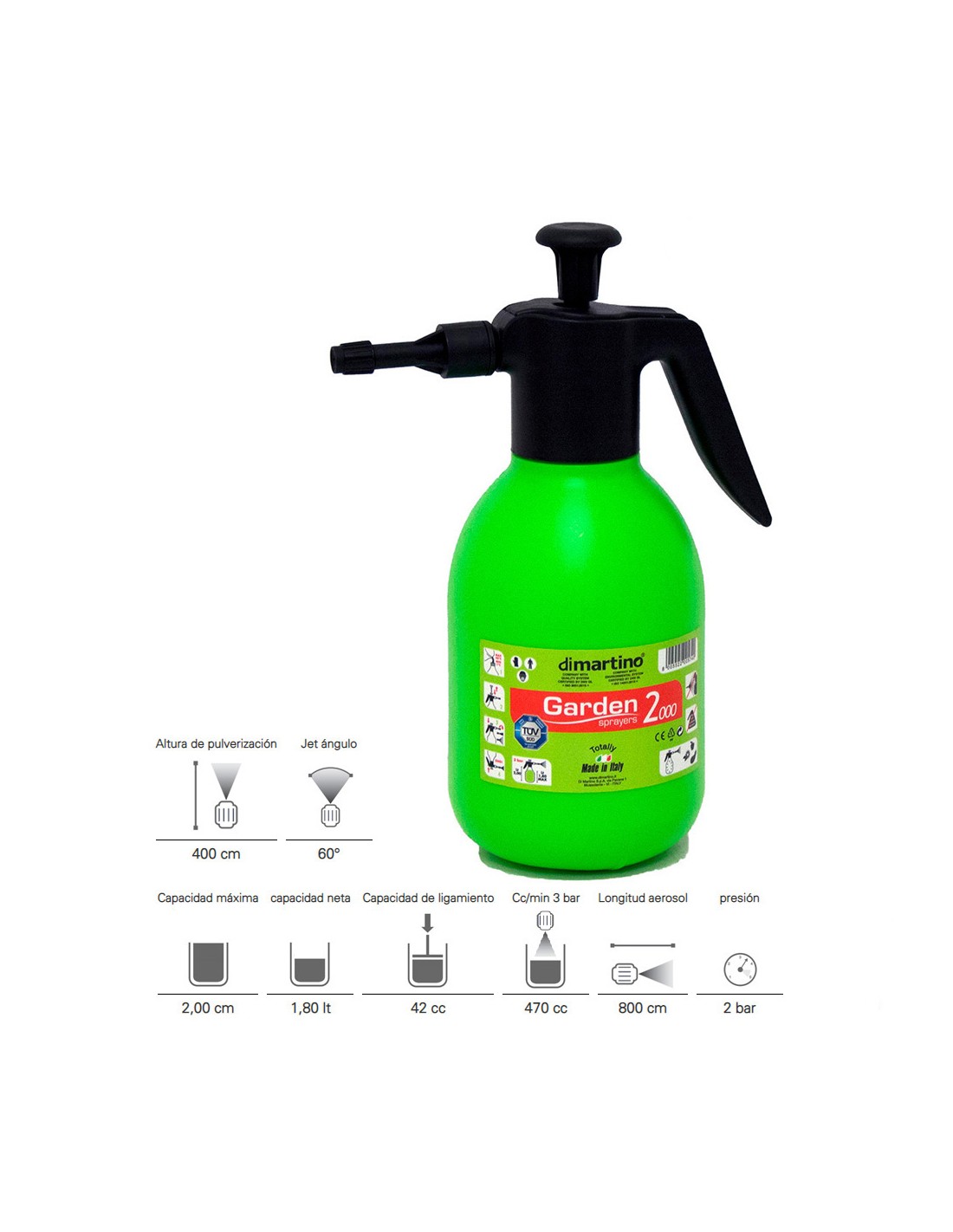 Vaporizador - pulverizador 2 l dimartino, varilla de acero, valvula que mantiene largo tiempo la presion, canuto sustituible, boquilla regulable, resortes de acero inoxidables, palanca de seguridad, nebulizacion uniforme, agujero calibrado, altura de pulverizacion 400cm, jet angulo 60°, 2 bar