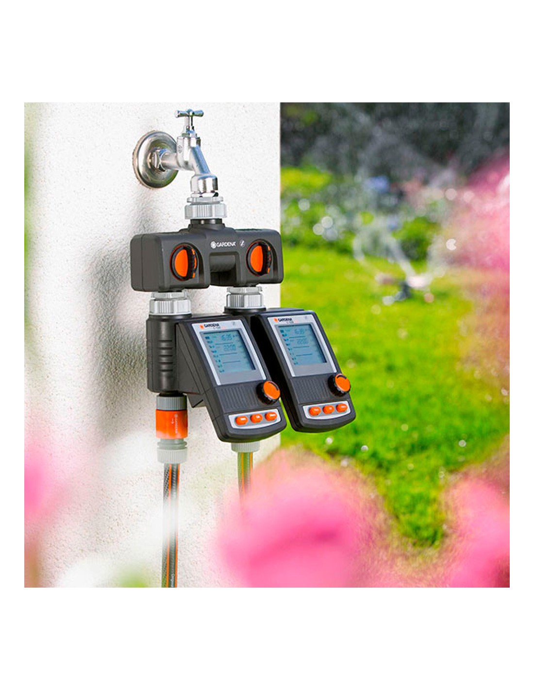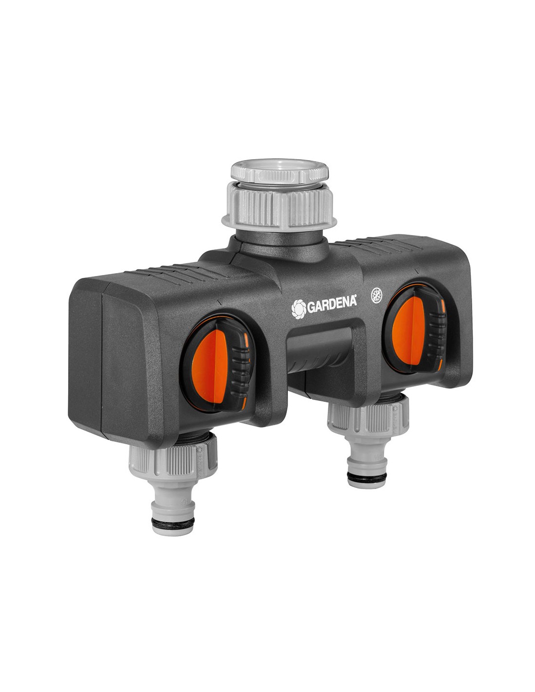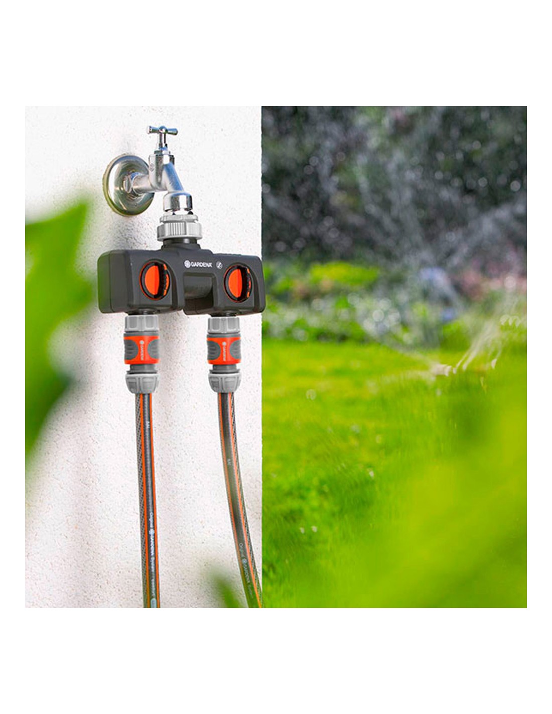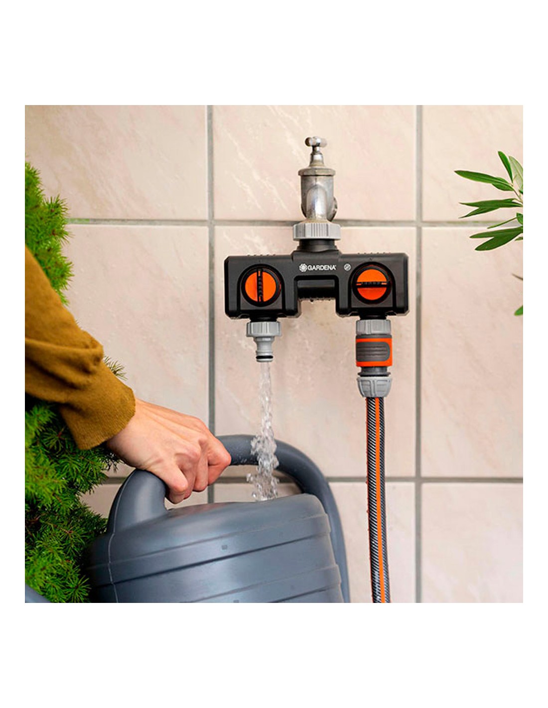 Distribuidor 2 vías gardena con adaptador, para grifos de 21mm (1/2") 26,5mm(3/4") 33,3mm (1") para el funcionamiento de 2 aparatos de conexión. regulación y cierre del caudal de agua. material: polipropileno. tratamiento anti uv y anti algas. proteccion contra el hielo. gardena