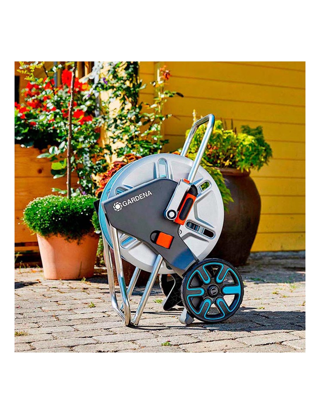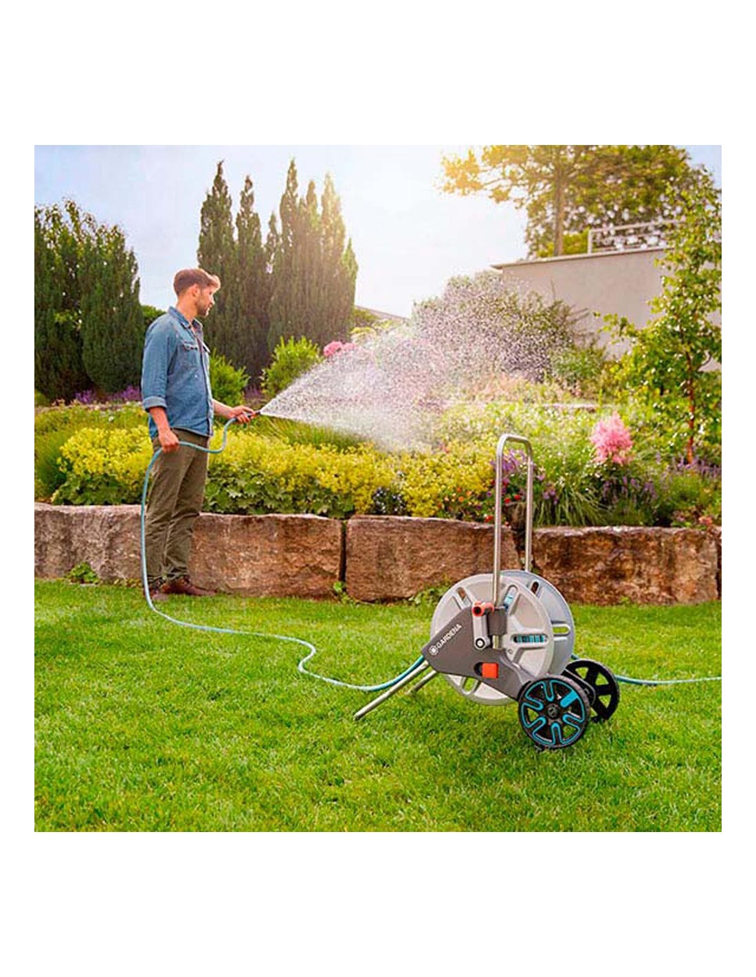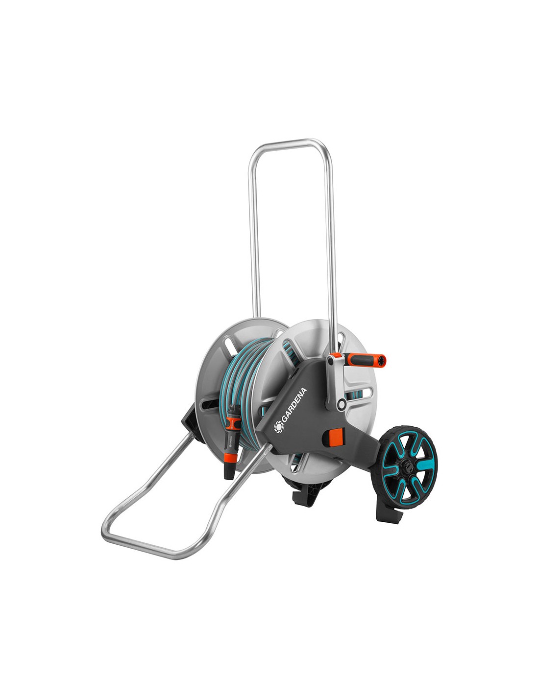 Carro de metal con manguera gardena. manguera de ø15mm (5/8") 25m. manivela de metal. soporte plegable. manillar de altura ajustable. conexión inclinada de la manguera. sistema anti-goteo. manivela lateral de libre movimiento (derecha/izquierda). sistema kick & stand. conexiones original gardena system y lanza.