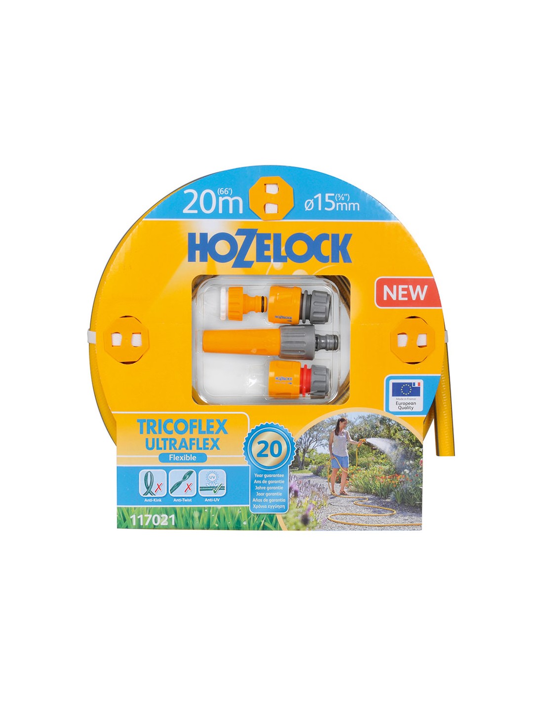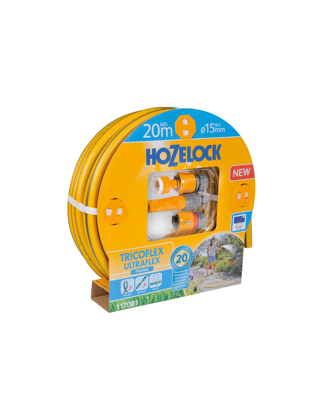 Kit manguera tricoflex ultraflex ø15mm 20m (incluye lanza y conectores) 117021 hozelock. manguera tricotada, flexible y antidobleces de 5 capas.la protección contra heladas y contra rayos uv garantiza que su manguera pueda usarse eficazmente en climas con temperaturas de -15°c a 60°c. la tecnología ergorib ofrece una excelente resistencia a la torsión, dando una sensación de ligereza y flexibilidad que le permite manejar su manguera fácilmente por el jardín con el mínimo esfuerzo. la tecnología antitorsión tricotada garantiza que la manguera no se tuerza bajo presión, proporcionando un flujo continuo de agua, y elimina las frustraciones que provoca una manguera al retorcerse. la tecnología soft & flex™ proporciona una resistencia excelente. capa interior lisa para mejorar el flujo de agua. no contiene pflalato: nuestras mangueras no contienen pflalatos, metales pesados ni toxinas perjudiciales. ultraflex cuenta con una garantía de 20 años. nuestra gama de mangueras tricotadas están fabricadas con un 40% de pvc reciclado.