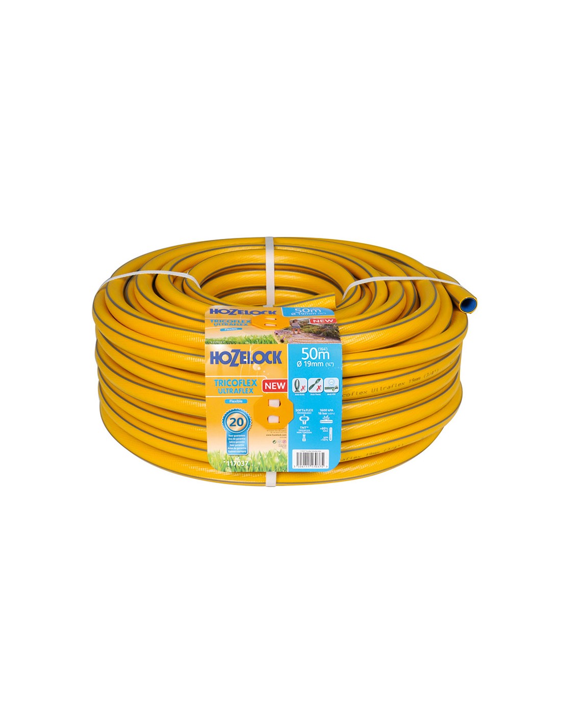 Manguera tricoflex ultraflex ø19mm 50m 117037 hozelock. manguera tricotada, flexible y antidobleces de 5 capas. la protección contra heladas y contra rayos uv garantiza que su manguera pueda usarse eficazmente en climas con temperaturas de -15°c a 60°c. la tecnología ergorib ofrece una excelente resistencia a la torsión, dando una sensación de ligereza y flexibilidad que le permite manejar su manguera fácilmente por el jardín con el mínimo esfuerzo. la tecnología antitorsión tricotada garantiza que la manguera no se tuerza bajo presión, proporcionando un flujo continuo de agua, y elimina las frustraciones que provoca una manguera al retorcerse. la tecnología soft & flex™ proporciona una resistencia excelente. capa interior lisa para mejorar el flujo de agua. no contiene pflalato: nuestras mangueras no contienen pflalatos, metales pesados ni toxinas perjudiciales. ultraflex cuenta con una garantía de 20 años. nuestra gama de mangueras tricotadas están fabricadas con un 40% de pvc reciclado.