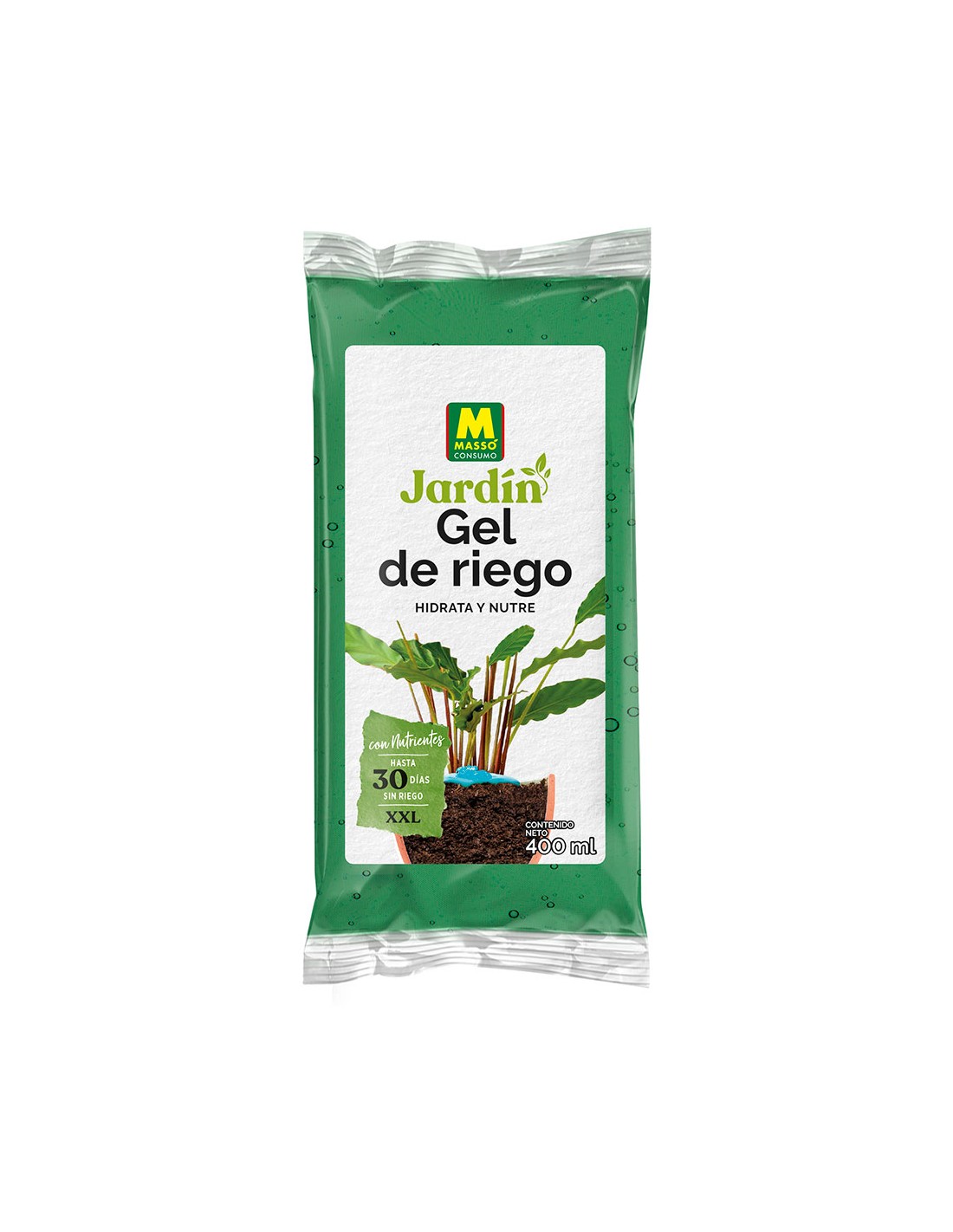 Gel de riego 400ml. mantiene la humedad del sustrato hasta 30 dias. proporciona agua y alimento en periodos sin riego. para plantas en macetas y jardineras. con nutrientes. massó