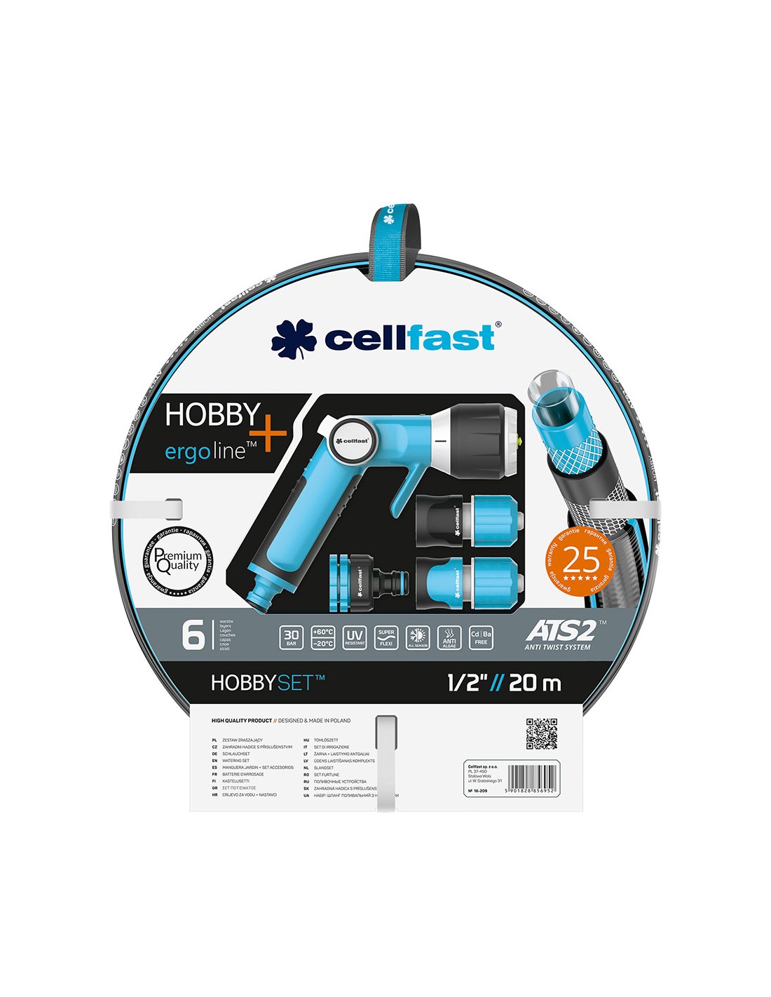 Set de riego que contiene 20 metros de manguera hobby de 12,5 mm de diametro ademas de, conector a grifo, conector rápido, conector con sistema water stop y pistola de riego multifunción ergo. la manguera de riego es de 6 capas en pvc + refuerzo textil tricotado elicoidal y sistema anti torsión avanzado. de 21,5 mm de diametro y 20 m de largo. hasta 30 bar de presión, agunta temperaturas que van de los -20 c hasta los 60 c. resistente a los rayos uv del sol, muy flexible y provista de sistema antitorsión de segunda generación. sistema antialgas y cumple con la normativa europea reach (libre de ftalatos)
