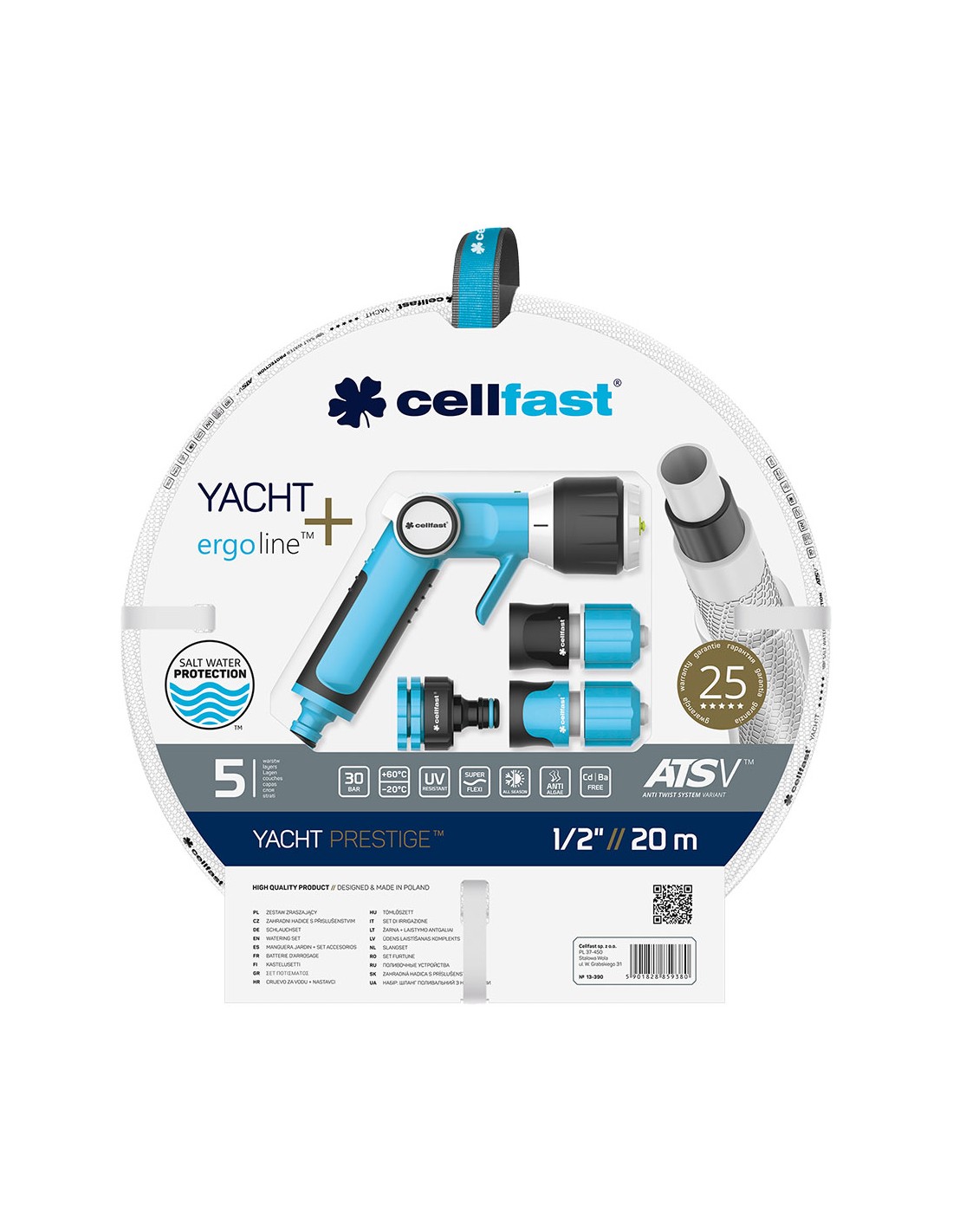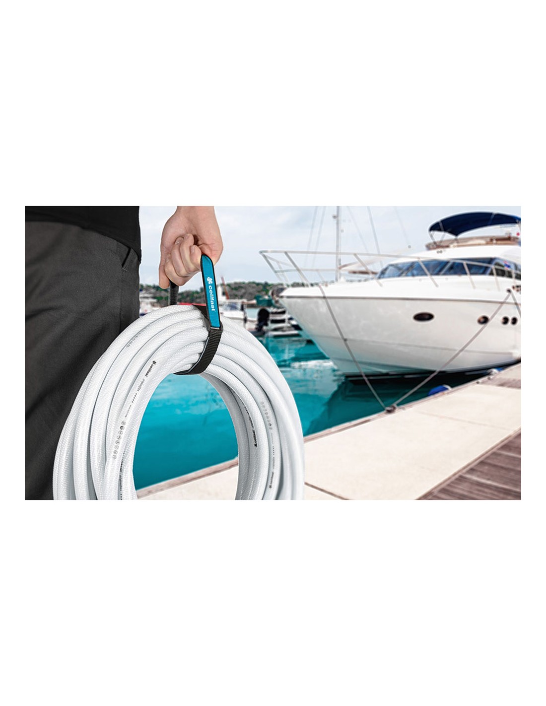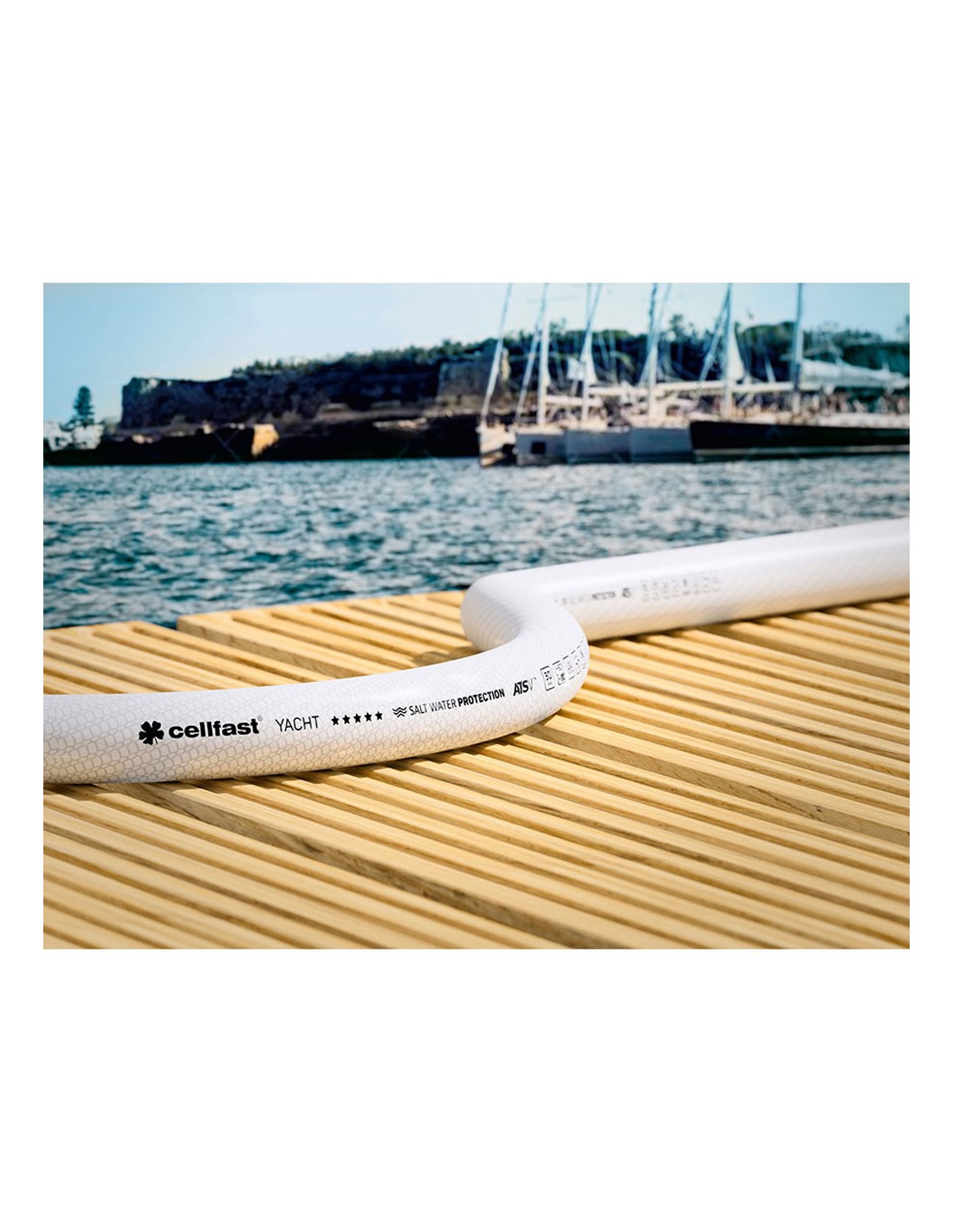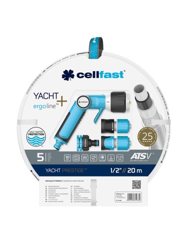 Set nautico que contiene 20 metros de manguera yacht blanca de 12,5 mm de diametro ademas de, conector a grifo, conector rápido, conector con sistema water stop y pistola de riego multifunción ergo. la manguera de riego es de 5 capas en pvc + refuerzo textil tricotado elicoidal y sistema anti torsión de 12,5 mm de diametro y 20 m de largo. hasta 30 bar de presión, agunta temperaturas que van de los -20 c hasta los 60 c. resistente a los rayos uv del sol, muy flexible y provista de sistema antitorsión. sistema antialgas y cumple con la normativa europea reach (libre de ftalatos) y protección especial a corrosión de la sal del mar