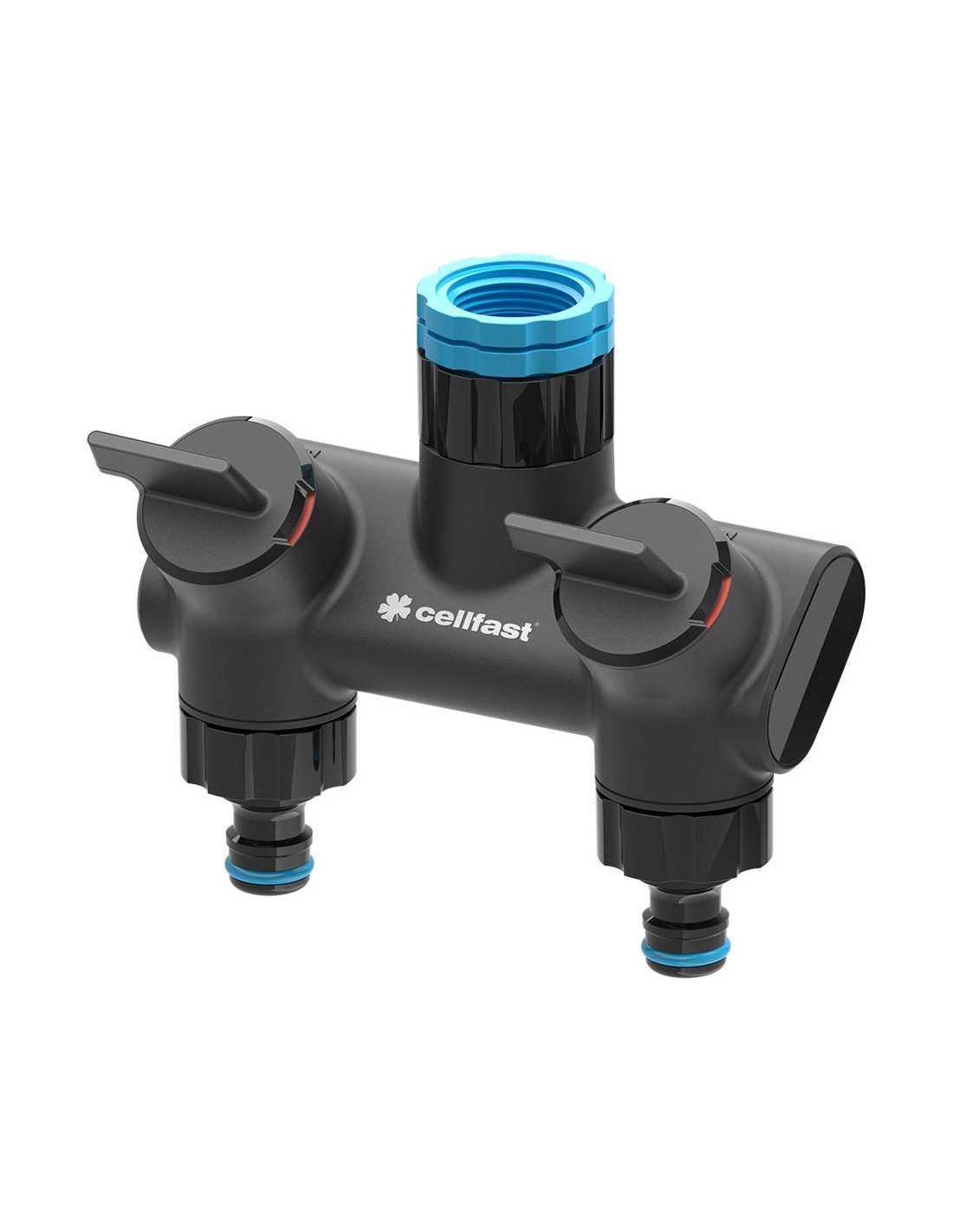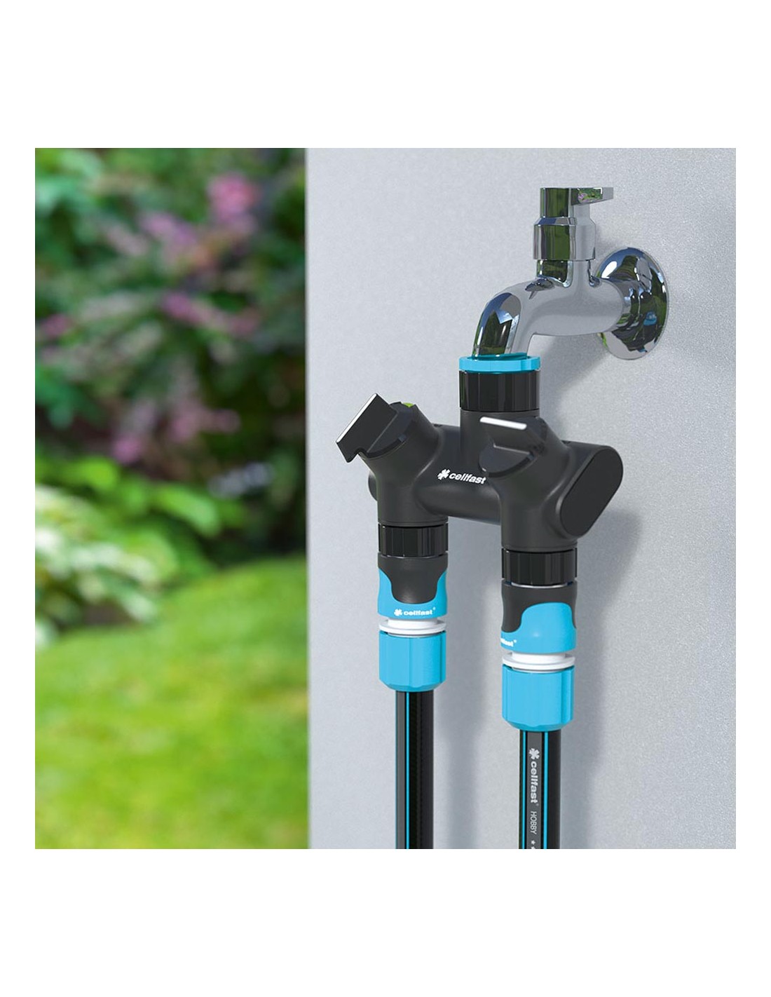 Distribuidor doble ergo de conectores rápidos. fabricado en abs de alta calidad. se conecta al grifo del jardín (provisto de rosca en dos medidas) para poder conectar individualmente dos mangueras o una manguera y disponer de un grifo para cargar la regadera. provisto de dos grifos individualizados para regular el caudal de salida.