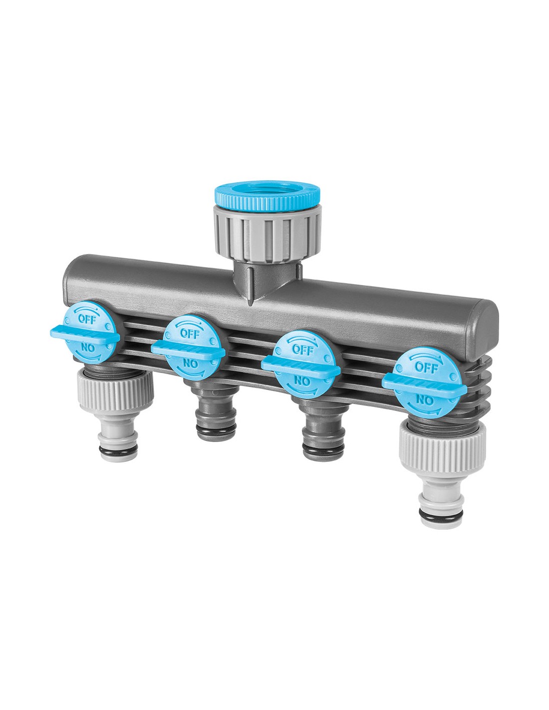Distribuidor de 4 salidas ideal de conectores rápidos. fabricado en polipropileno y abs de alta calidad. se conecta al grifo del jardín (provisto de rosca en dos medidas) para poder conectar individualmente cuantos elementos de riego necesite. rovisto de 4 grifos individualizados para regular el caudal de salida.