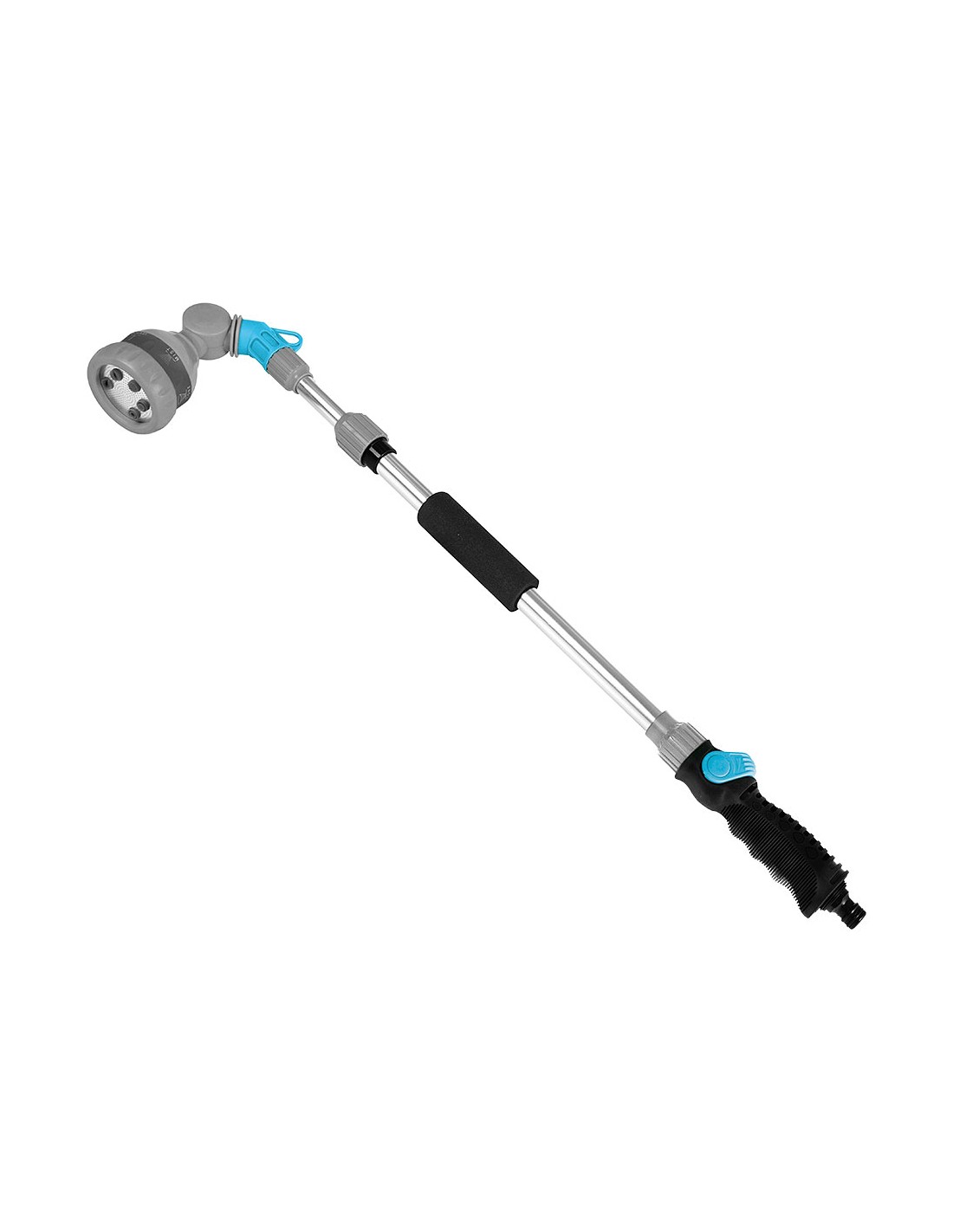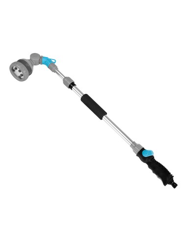 Lanza de riego telescopica ideal de 6 funciones. regulable en altura y en angulo del cabezal para una perfecta adptación a cualquier trabajo en altura. regulación de caudal y sistema safe touch para un perfecto agarre. fabricado en polipropileno, abs y acero de alta calidad