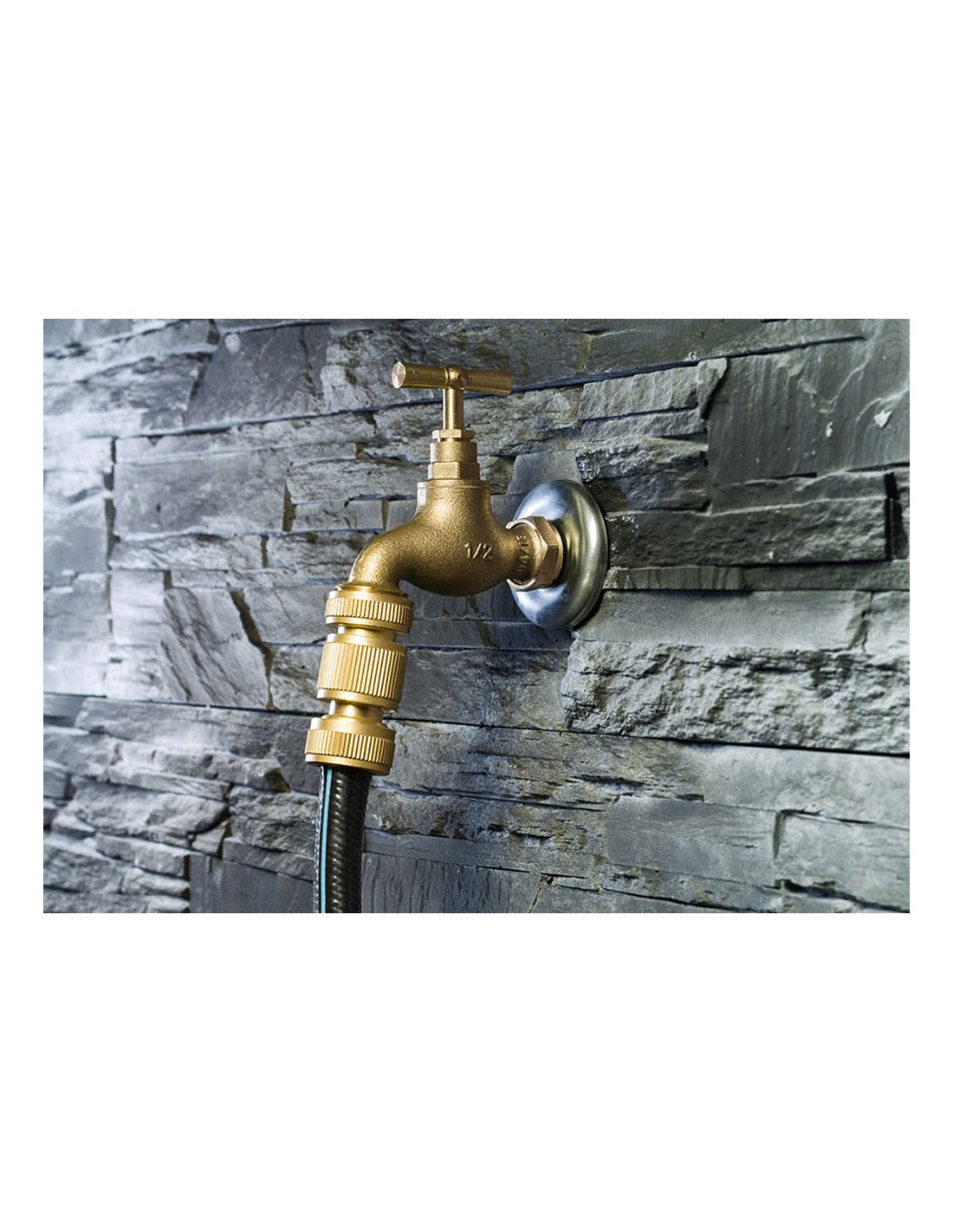 Conector a grifo universal tipo latón, ideal para rosca hembra de 1/2" y 3/4" fabricado en latón de alta resistencia. el blister se sirve con dos roscas adaptables para que pueda enroscarse tanto en grifos de 1/2" como en los de 3/4" convirtiendolo en un conector rápido para sus mangueras y accesorios de riego