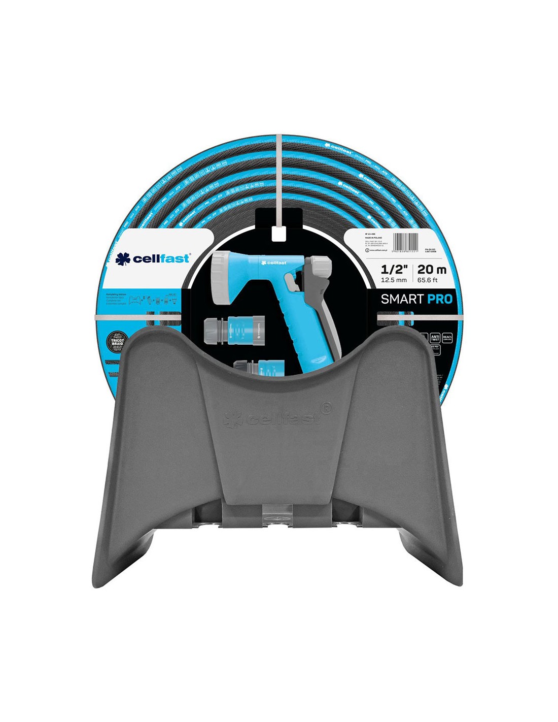 Set de riego que contiene 20 metros de manguera smart pro de 12,5 mm de diametro ademas de, conector a grifo, conector rápido, conector con sistema water stop, pistola de riego hydron ideal y colgador mural. la manguera de riego es de 4 capas en pvc + refuerzo textil tricotado helicoidal y sistema anti torsión. hasta 25 bar de presión, aguanta temperaturas que van de los -20 c hasta los 60 c. resistente a los rayos uv del sol, muy flexible y provista de sistema antitorsión. sistema antialgas y cumple con la normativa europea reach (libre de ftalatos)