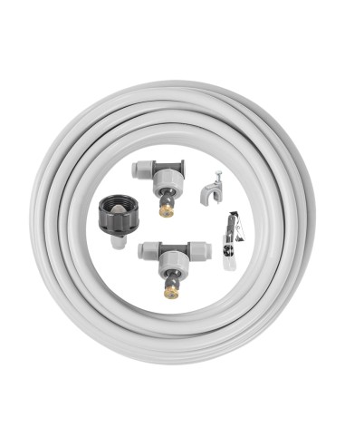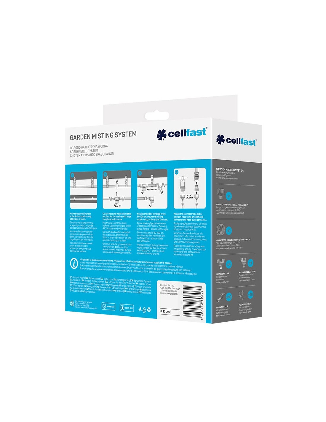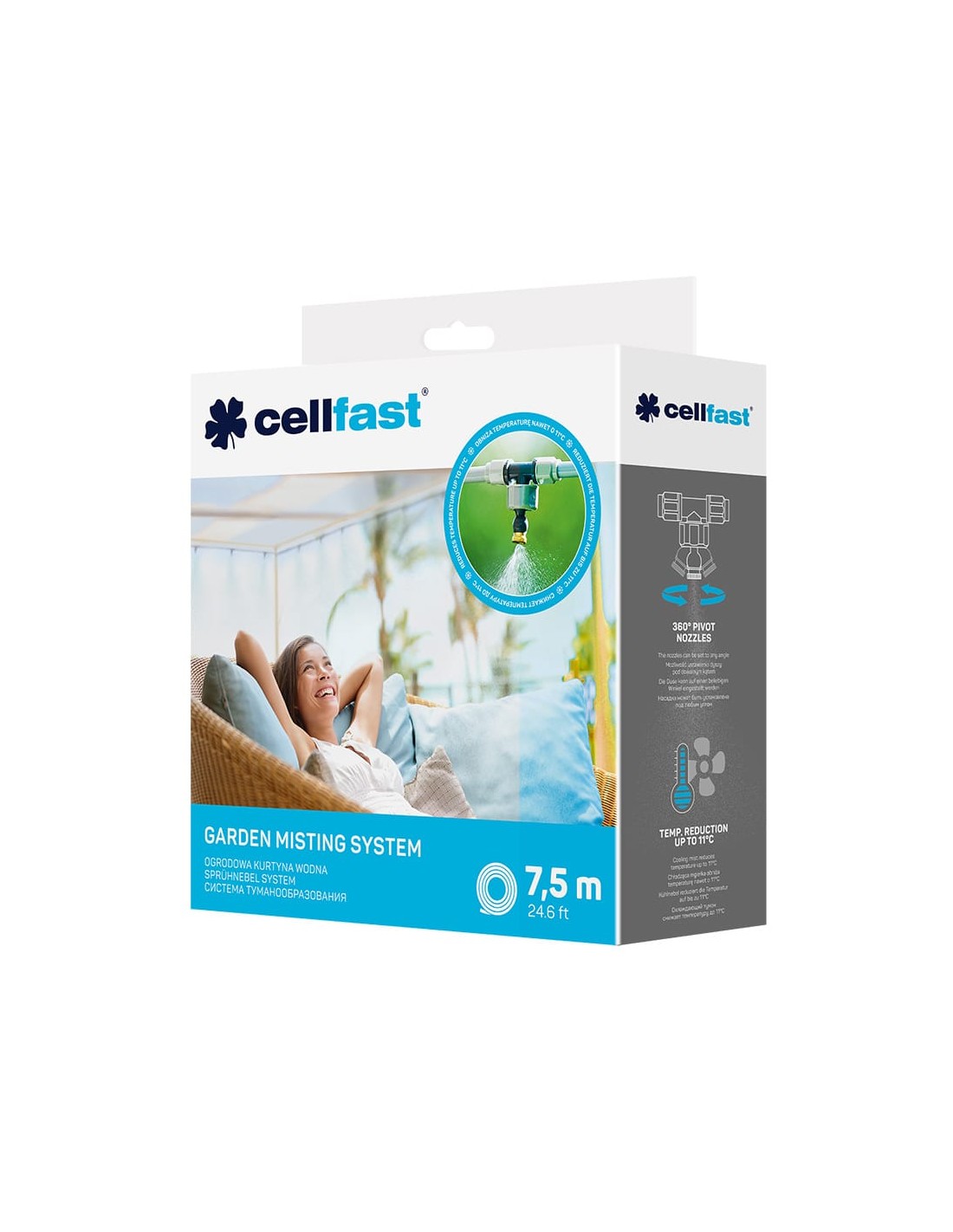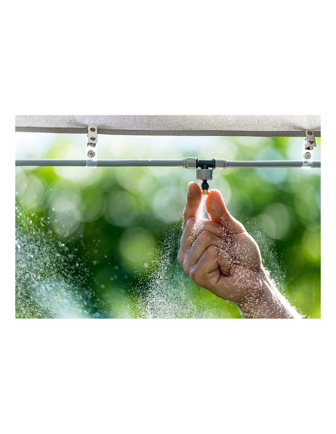 Set de climatización para exterior que reduce hasta 11 grados centígrados la sensación de calor. compuesto de tubo de 8mm de diámetro y 7,5m de longitud, conexión a la general hembra de g3/4", 4 nebulizadores, 1 nebulizador final de conexión, 10 clips de montaje, 10 abrazaderas. para colgar en el techo, pérgola o sombrilla, crea una cortina de agua que reduce considerablemente la temperatura. ideal para instalarlo con programador, temporizador, para seleccionar la frecuencia de activación. cellfast