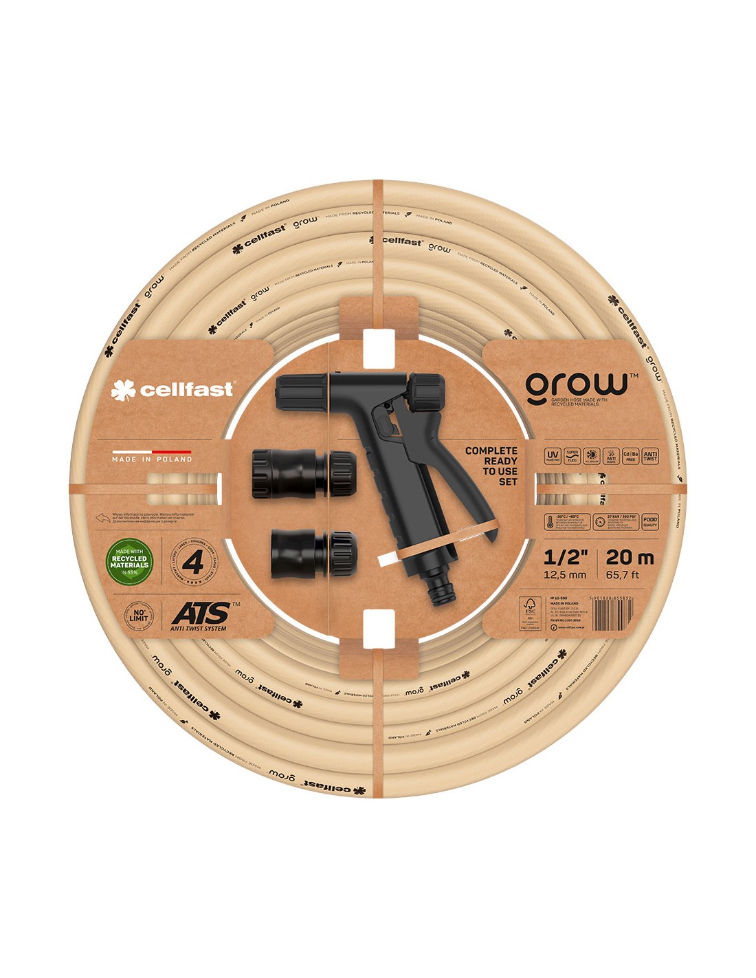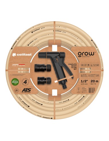 El kit de riego incluye: aspersor manual multifuncional, conector rápido, conector rápido stop, conector multifuncional con rosca hembra y manguera grow (20 m 1/2" 12,5 mm) de 4 capas resistente a la formación de nudos que bloquean el flujo de agua con refuerzo tricotado ats y resistente a los rayos uv y a la formación de algas en el interior de la manguera. robusta y flexible. soporta rango de temperatura -20/+60°c. con garantía de larga duración con uso adecuado. presión de rotura 27 bar. contiene un 55% de materiales reciclados. sin cadmio, bario ni plomo y libre de ftalatos.