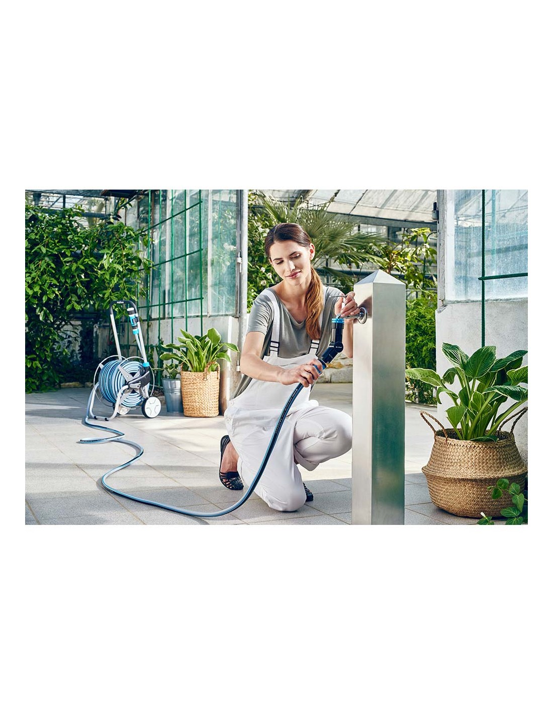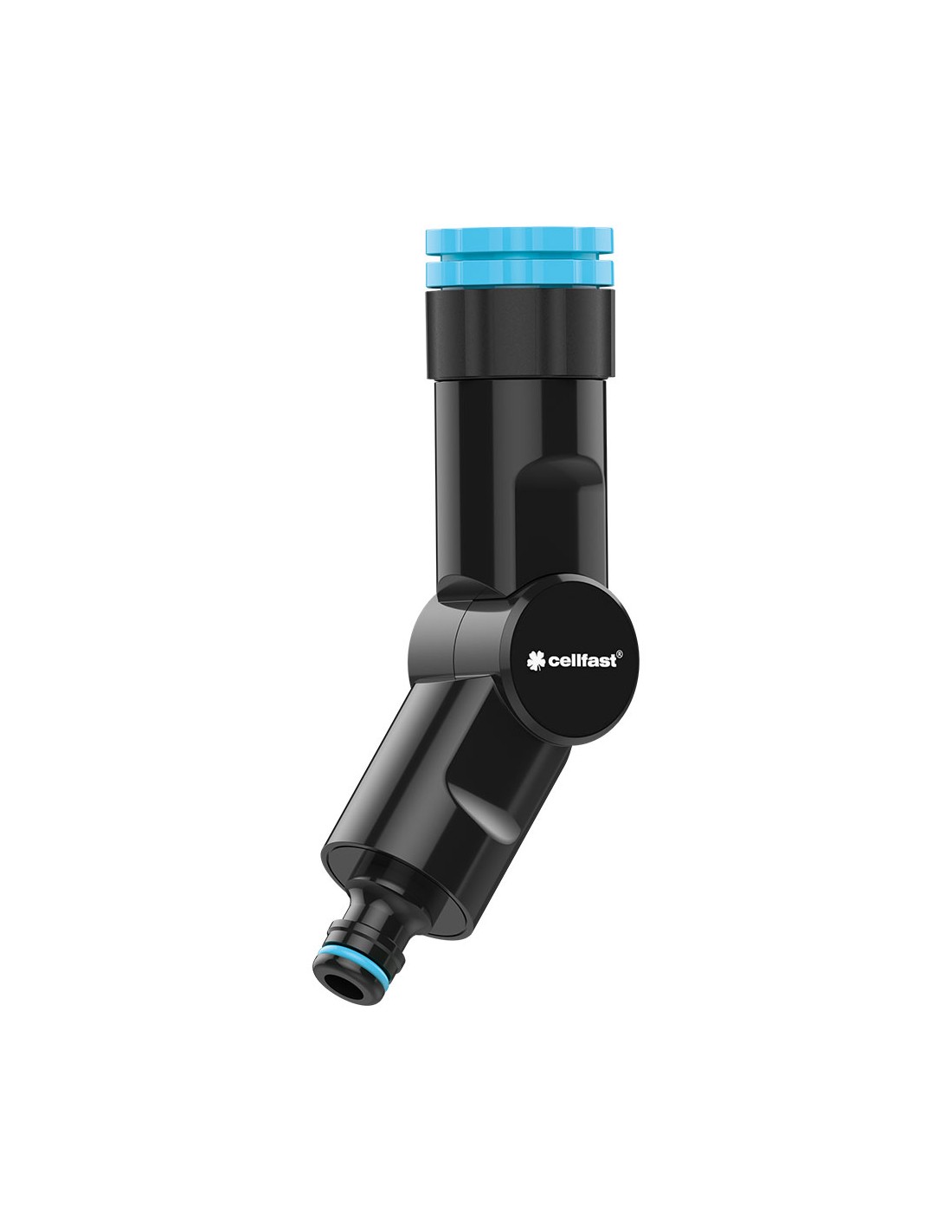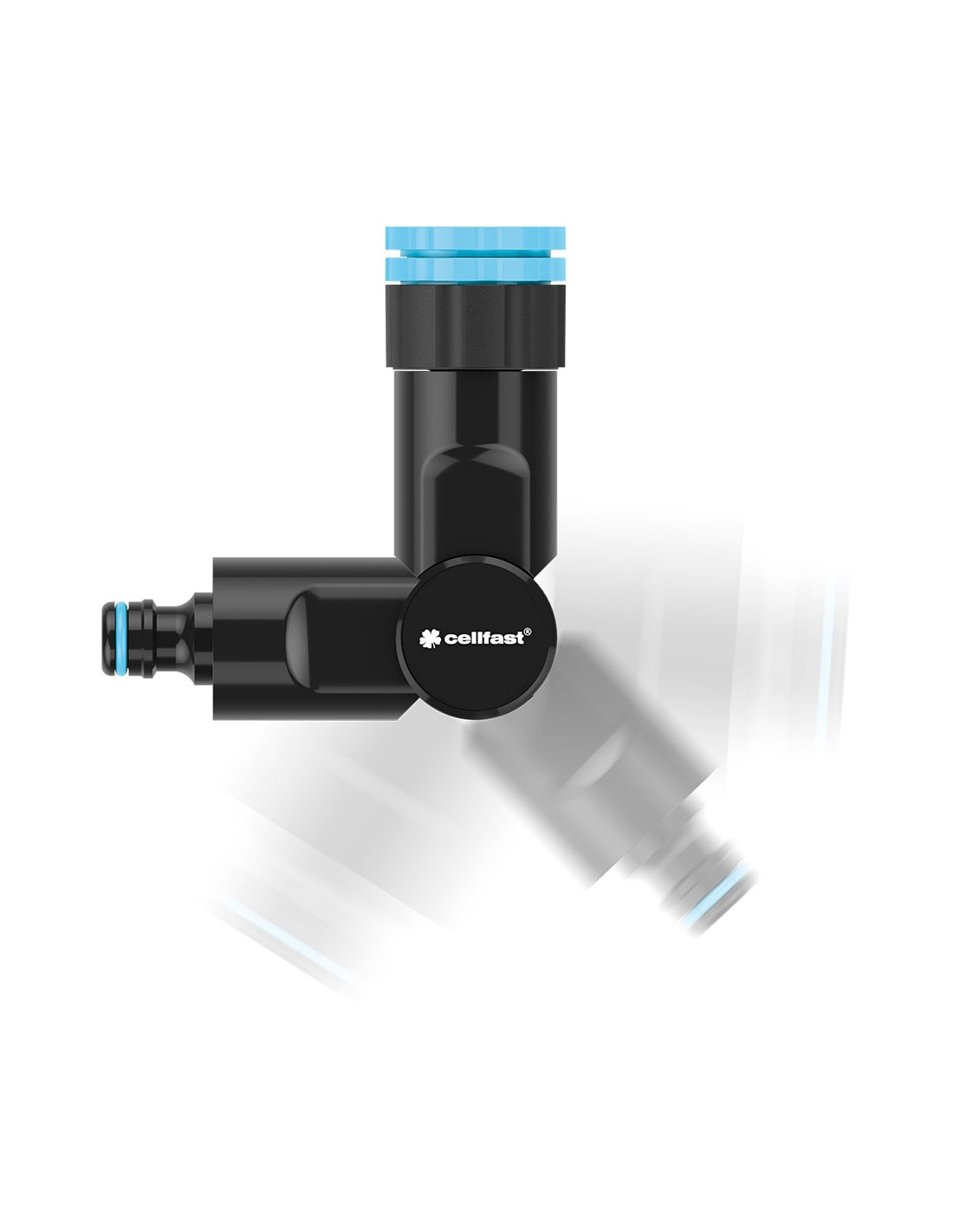 Conector angular reforzado con rosca hembra y forma ergonómica para una conexión rápida y cómoda a la fuente de agua. con posibilidad de giro horizontal de 360° y vertical de 180. apto para grifos de g1/2", g3/4" y g1. fabricado en material abs. máx 6 bar