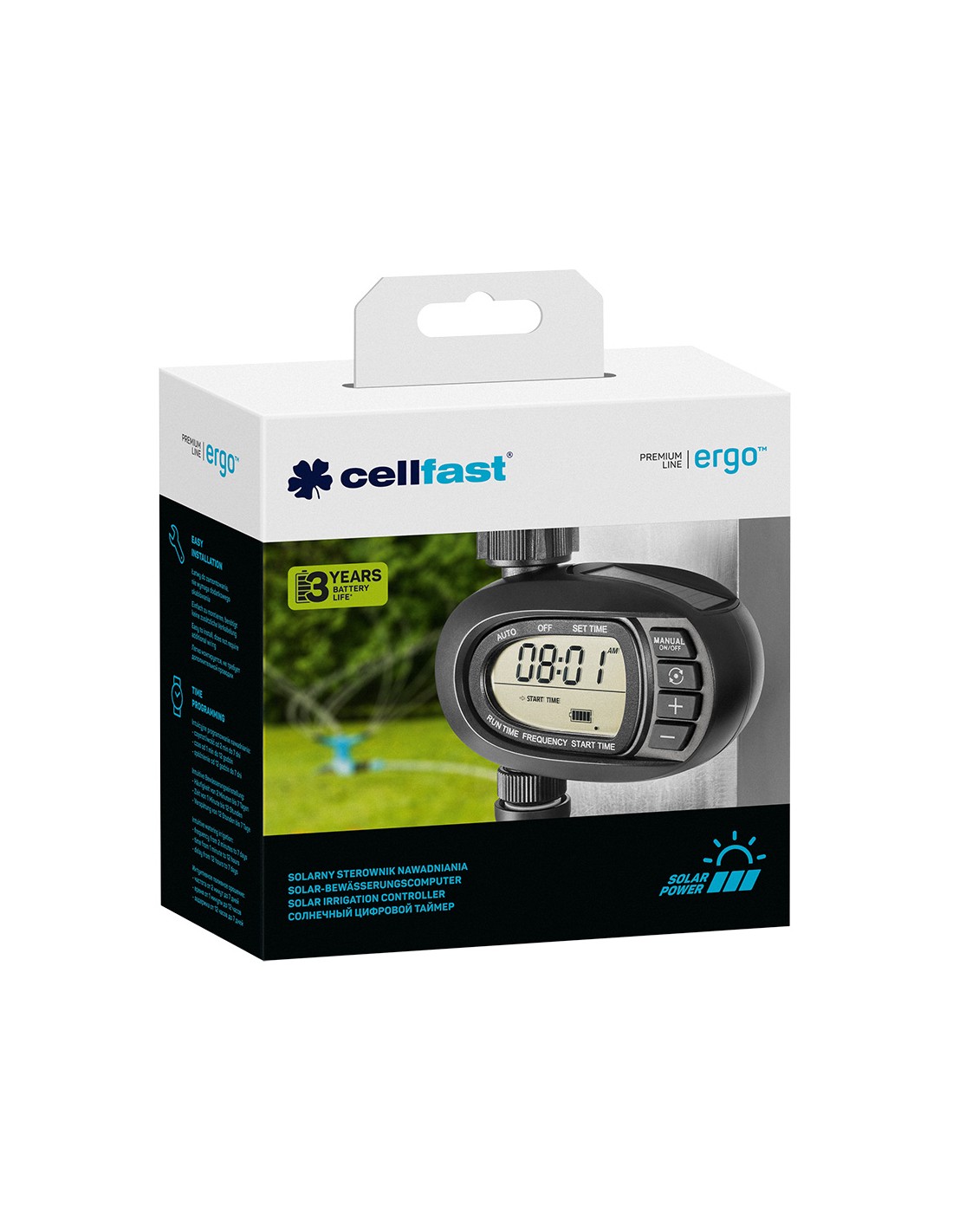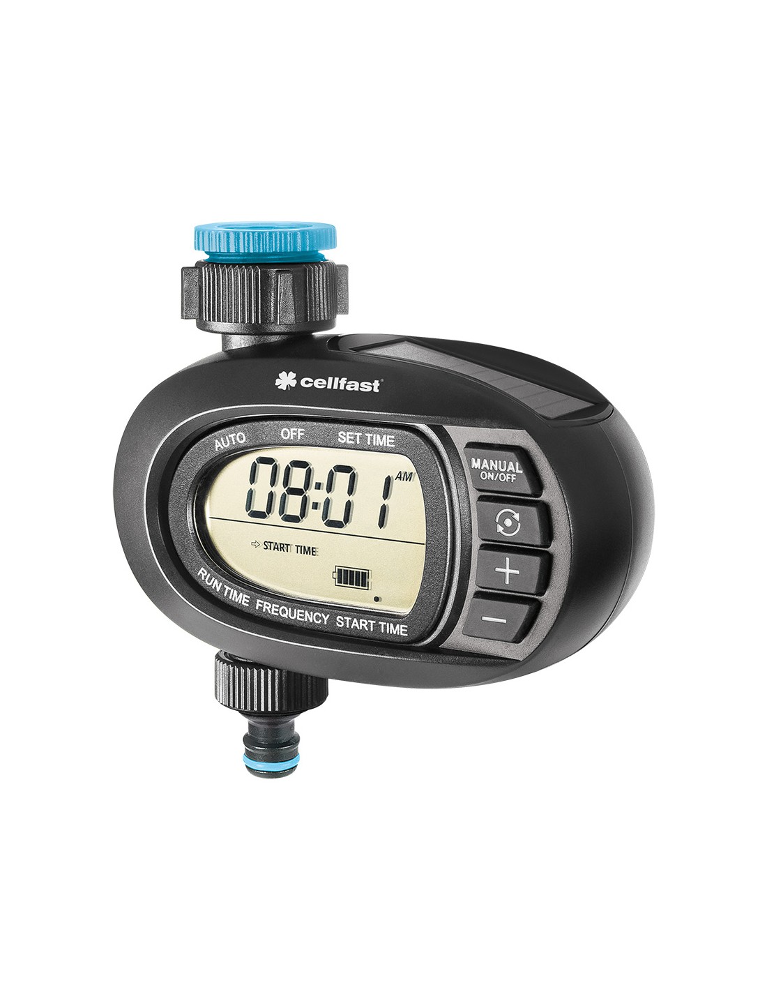 Programador de riego que funciona con energía solar, no requiere cambio de pilas. su pantalla clara facilita la programación. dispone de configuración automática y manual del tiempo de trabajo. sistema de riego intuitivo: frecuencia de 2 minutos a 7 días, tiempo de 1 minuto a 12 horas, retardo de 12 horas a 7 días. es fácil de instalar, no requiere cableado adicional. batería de iones de litio integrada. media hora de carga es suficiente para 2 meses de trabajo. el dispositivo informa sobre un nivel bajo de batería. se adapta a grifos g3/4" y g1
