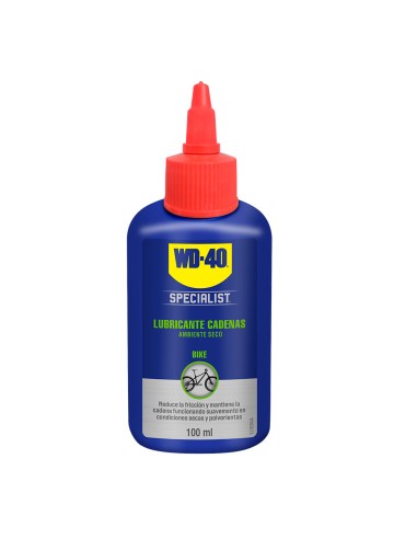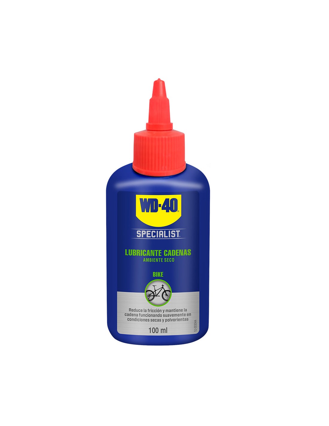 Lubricante seco 100ml wd40. el lubricante de cadenas para ambientes secos wd-40 bike se ha formulado especialmente para quienes acostumbran a disfrutar de su bicicleta en condiciones secas y polvorientas. esta fórmula proporciona una lubricación duradera que reduce extraordinariamente la fricción de la cadena gracias al ptfe. además crea una película protectora aislando los componentes de la cadena y la transmisión del polvo y la suciedad.puedes utilizar el lubricante de cadenas para ambientes secos wd-40 bike en cualquier tipo de cadenas así como en el cambio, el plato o el cassete. el lubricante de cadenas para ambientes secos wd-40 bike mejora el rendimiento de tu bicicleta, rebaja la fricción de la cadena y la protege incluso en las condiciones más secas y polvorientas.wd40