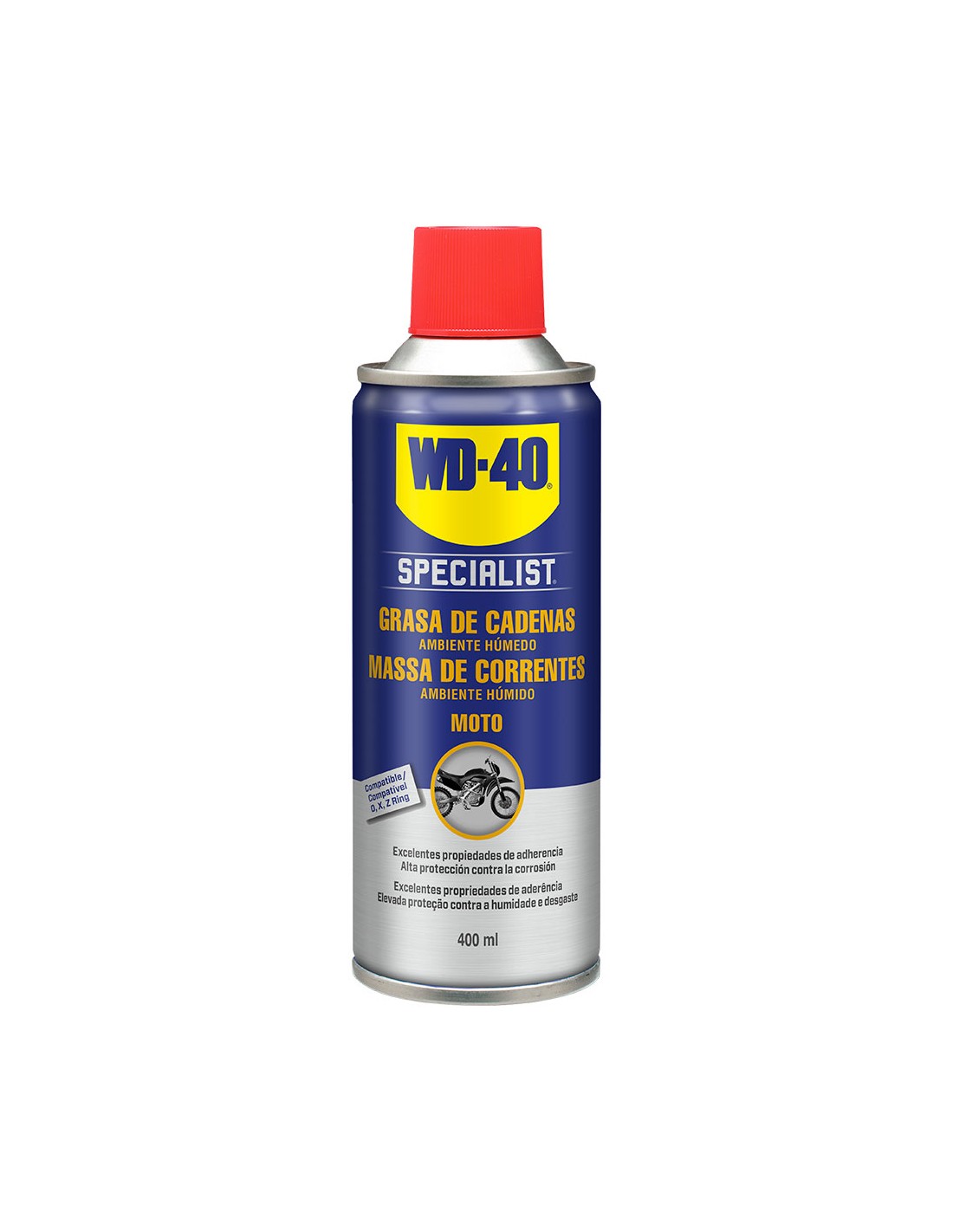 Grasa de cadenas 400ml wd40. este producto proporciona lubricación y protección duraderas para la cadena y es compatible con cadenas o, x y z ring. gracias a su excepcional protección contra la corrosión y al ptfe añadido, es particularmente adecuado para condiciones húmedas y aporta sobresalientes propiedades anti-goteo. un uso regular ayuda a mantener el rendimiento y la duración de la cadena.sobresalientes propiedades anti-goteo. protección contra la corrosión de secado rápido. mantiene el rendimiento de la cadena. wd40