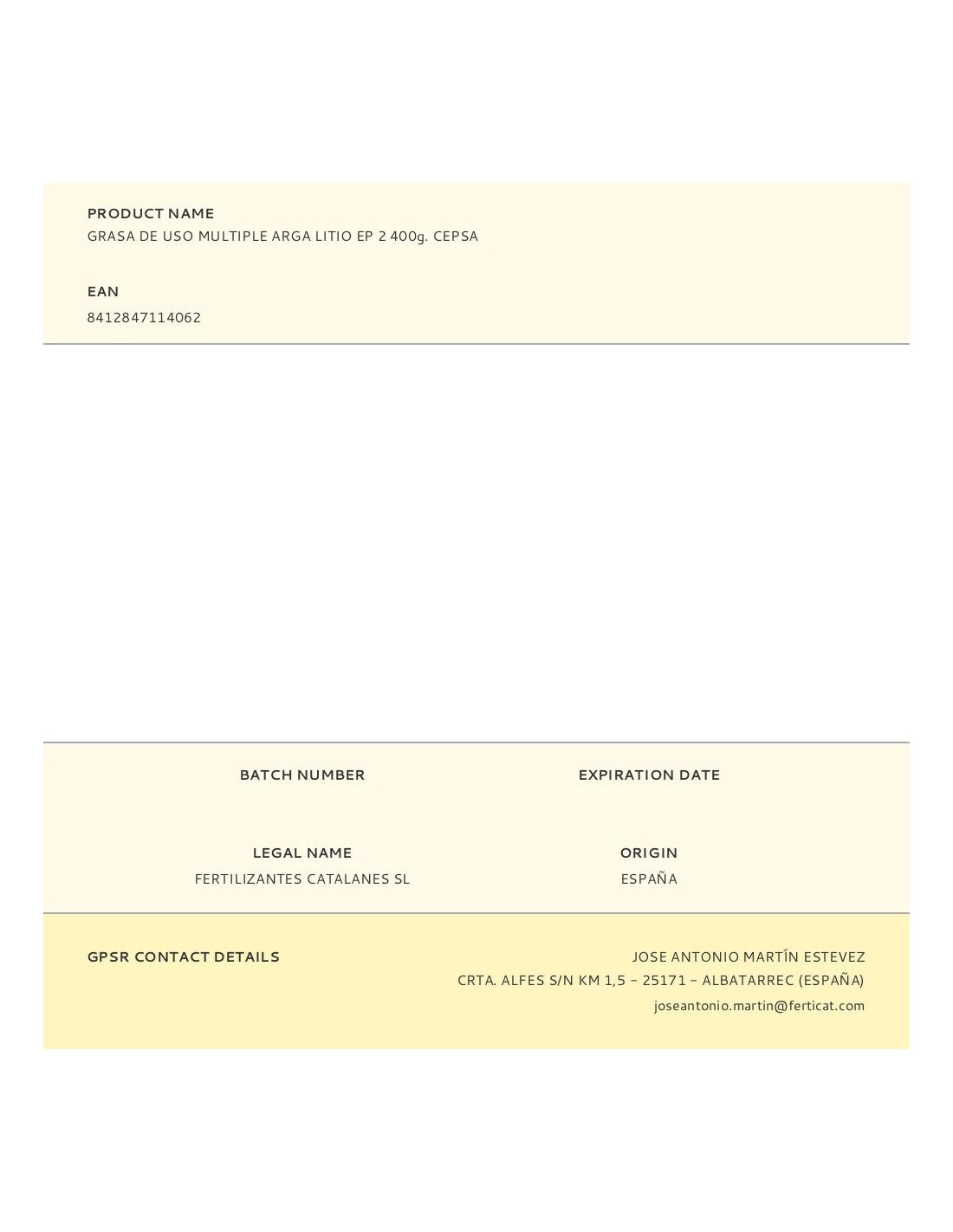 Grasa de uso multiple arga litio ep 2 400g. cepsa. para su aplicación en todo tipo de rodamientos y cojinetes planos, sistemas centralizados y engrasadores tecalemit, stauffer o a mano, para equipos industriales, marinos o automotrices, sometidos a cargas elevadas. buena protección antiherrumbre, anticorrosiva, antioxidante y antidesgaste. altamente resistente a la humedad y prácticamente insolubles en agua. temperatura de aplicación: -30c a +120c.
