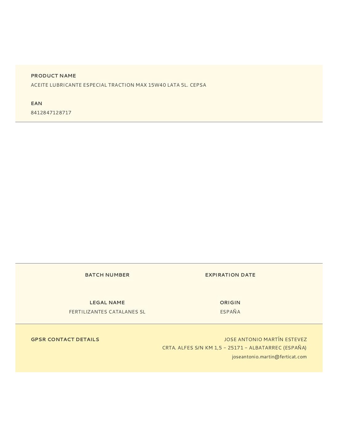 Aceite lubricante especial traction max 15w40 lata 5l. cepsa. lubricante de motor de máximo rendimiento y carácter global. especialmente recomendado para vehículos pesados europeos (acea e7), americanos (api ci-4) y asiáticos (jaso dhd-1) de última tecnología que cumplan las normativas de emisiones euro v, euro iv y anteriores que no equipen filtro de partículas dpf.