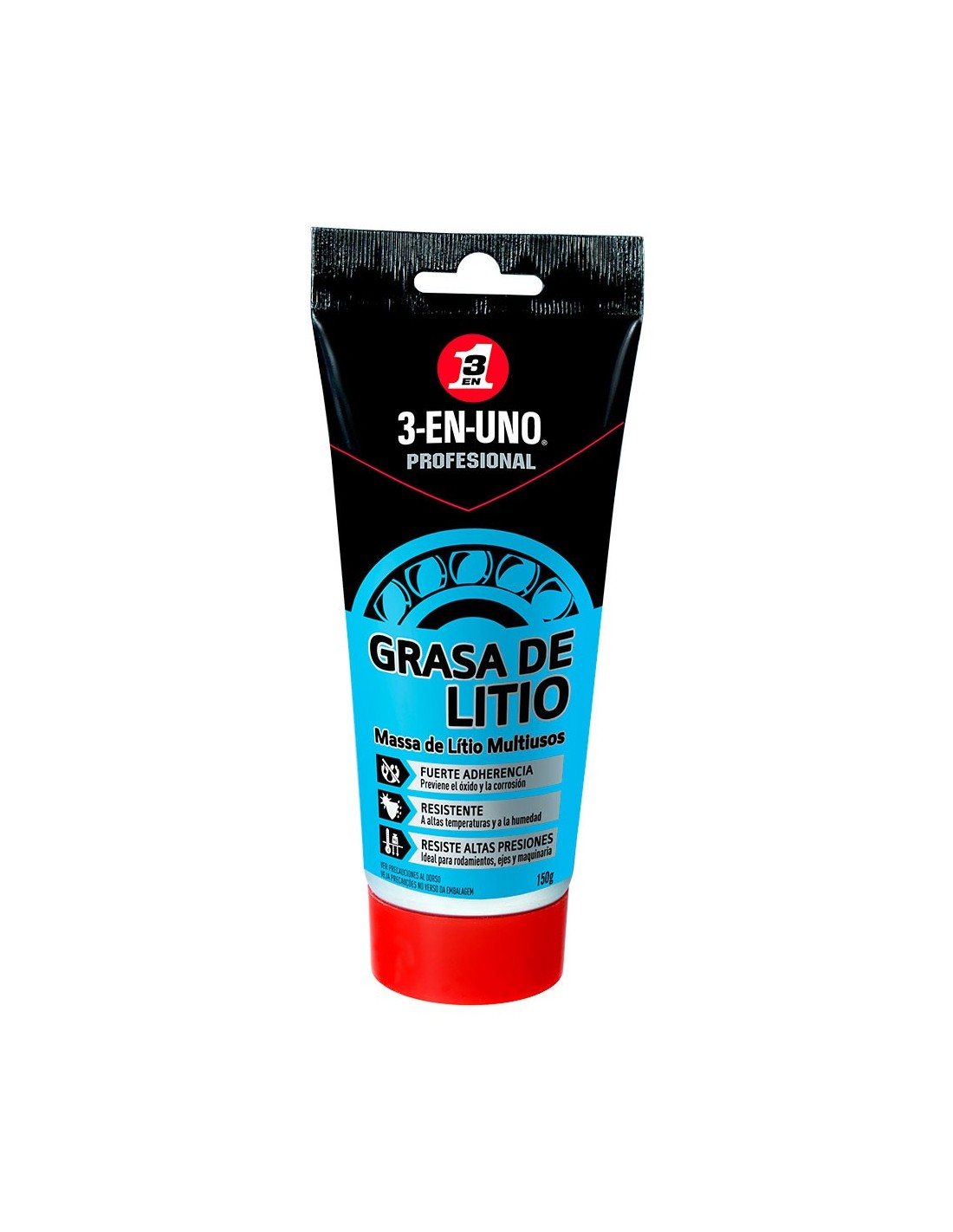 TUBO DE GRASA DE LITIO MULTIUSOS 150g 3 EN 1. COLOR CARAMELO.LUBRICACIÓN SUPERIOR Y DE LARGA DURACIÓN.PREVIENE EL ÓXIDO Y LA CORROSIÓN.EXCELENTE RESISTENCIA A LA PRESIÓN.CLASIFICACIÓN NLGI*: GRADO 2. RESISTE TEMPERATURAS DE -20°C A +140°C. RESISTENCIA AL AGUA (TEST ASTM D1264) A 39° C %: 5.PUNTO TRANSFORMACIÓN A LIQUIDO: 190°C VISCOSIDAD A 40°C