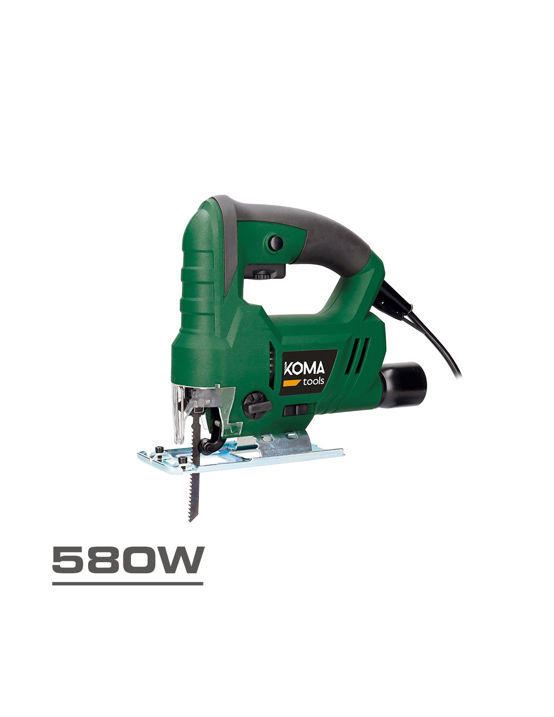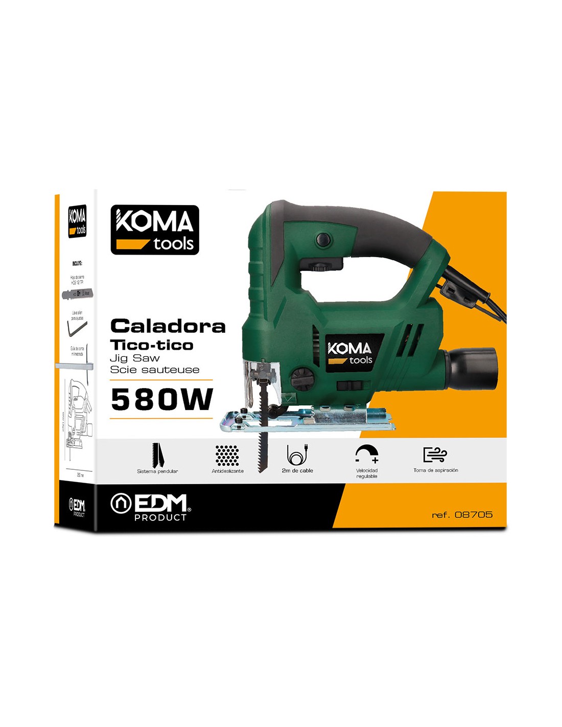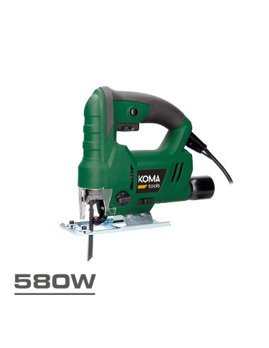 Caladora eléctrica. potencia: 580 w. 230-240 v 50 hz, velocidad en vacio de 0 a 3000rpm. control de potencia, sistema pendular, mango ergonomico de tacto suave, 2 m de cable, toma de aspiracion. accesorios: boquilla de conexión de aspirador, 1 sierra de madera, 1 varilla de profundidad, 1 llave hexagonal sc-580, 260 x 250 mm