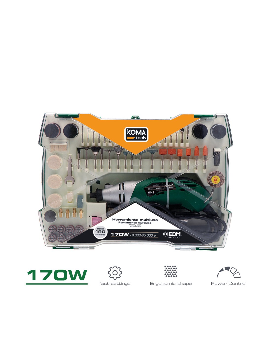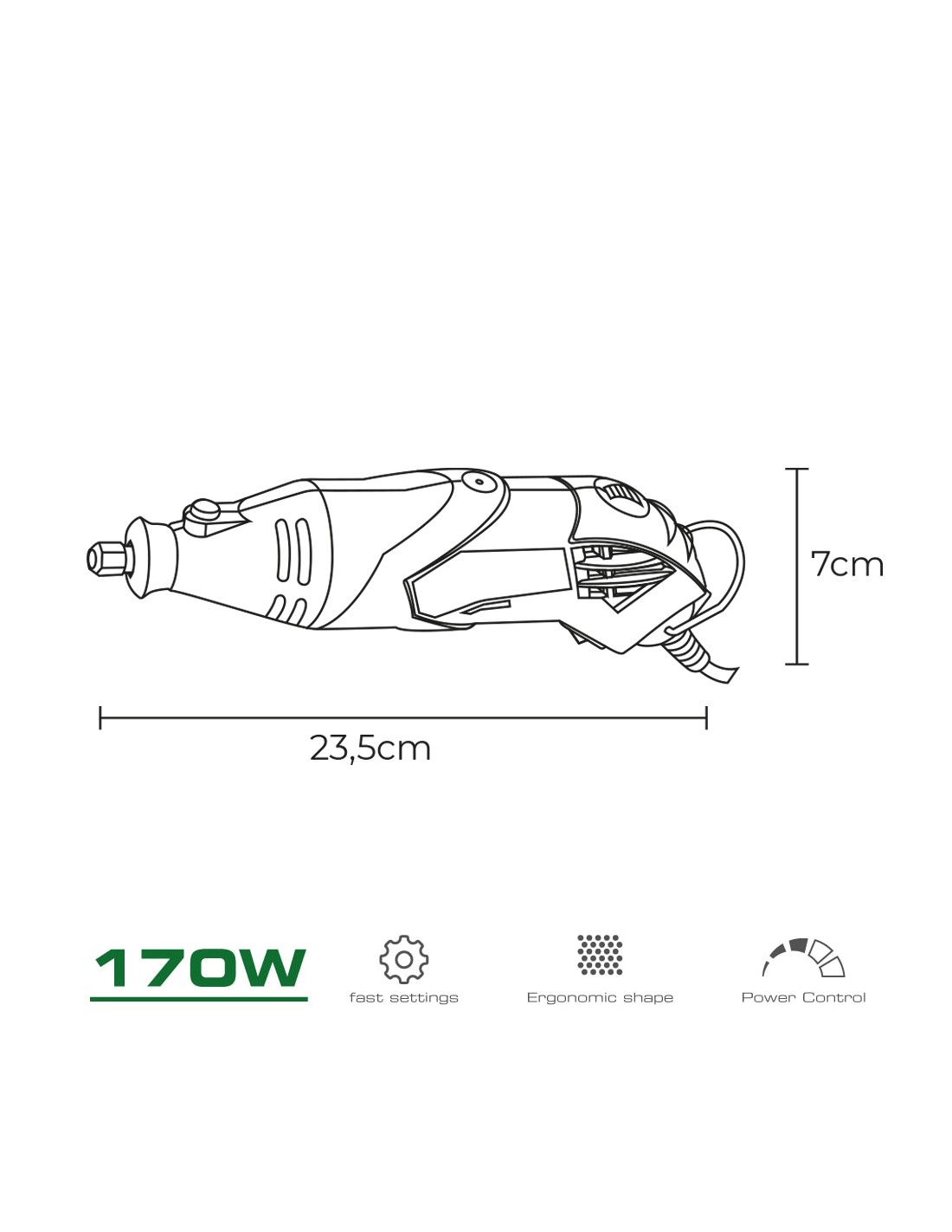 Herramienta multiusos rotativa. potencia: 170w. 2 m de cable electrico. velocidad variable de 8000-35000rpm. 41 tipos de accesorio (190 piezas en total) para tallar, fresar, amolar, limpiar, pulir, cortar, lijar y grabar + 1 cable rotativo-flexible de 2 m. 220-240v 50hz. mr-170, dimensiones: 23,5 x 7 cm