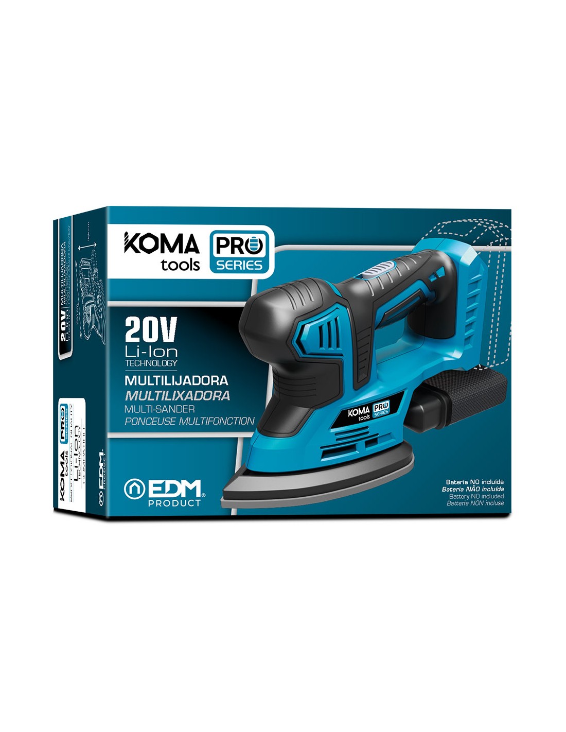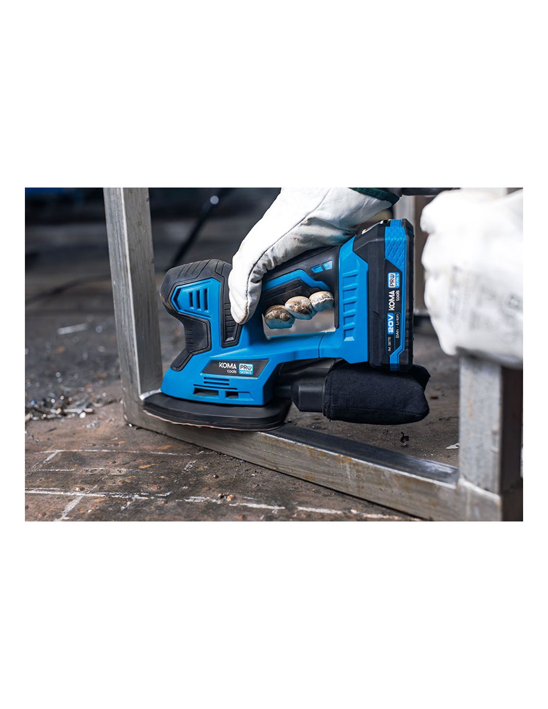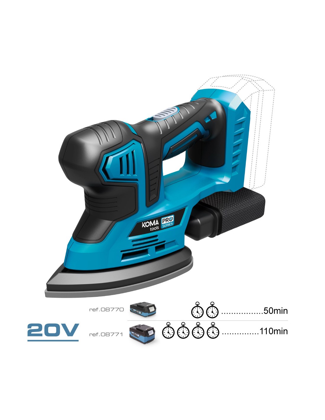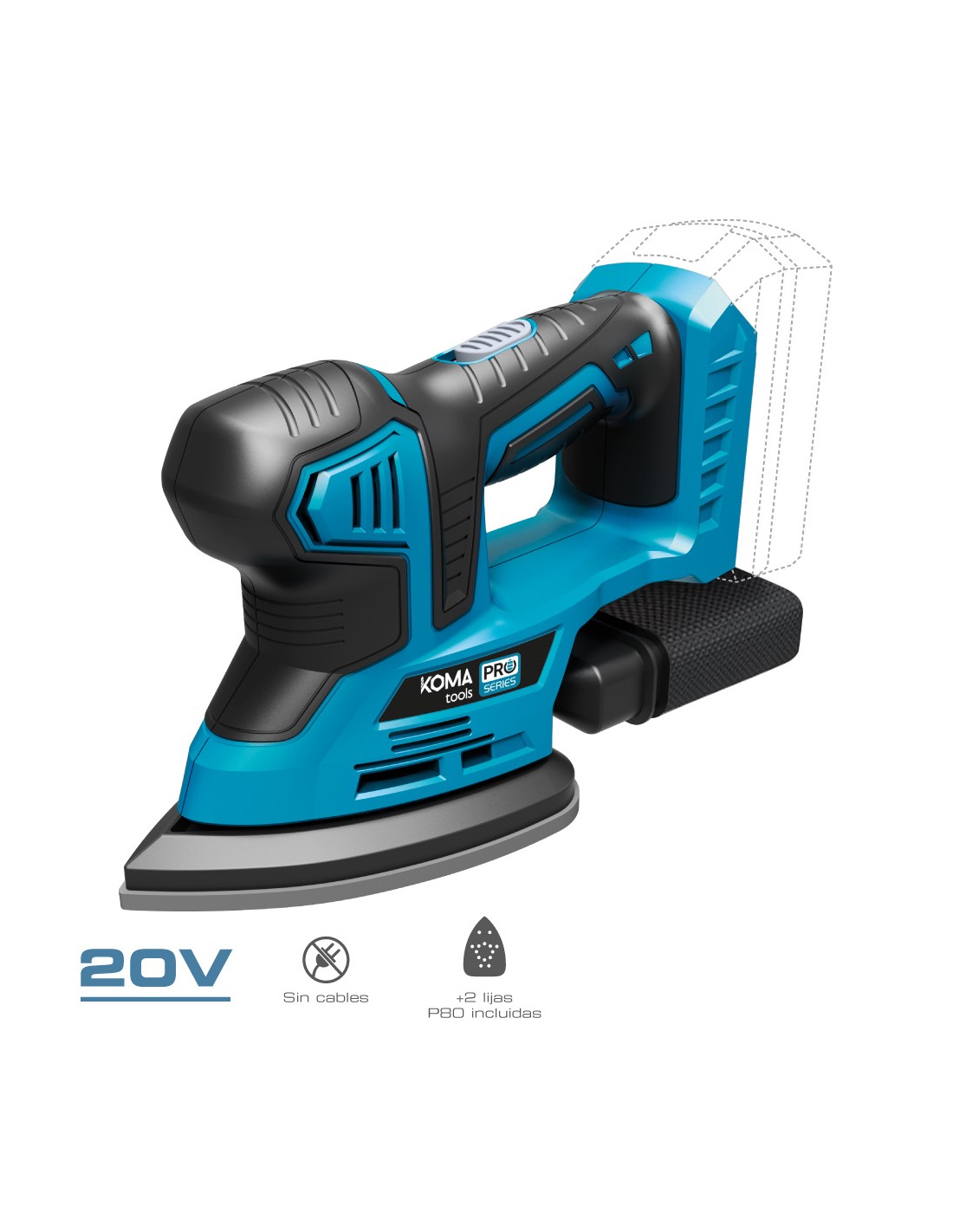 Lijadora de bateria li-on. potencia: 20 v y 2,0a. sin batería ni cargador. 1 velocidad de 0 a 12000rpm. mango ergonomico de tacto suave antivibracion. suela de velcro. accesorios: filtro recoge polvo + 2 lijas p80. 20v-lm. dimensiones: 20,4 x 15,5 cm