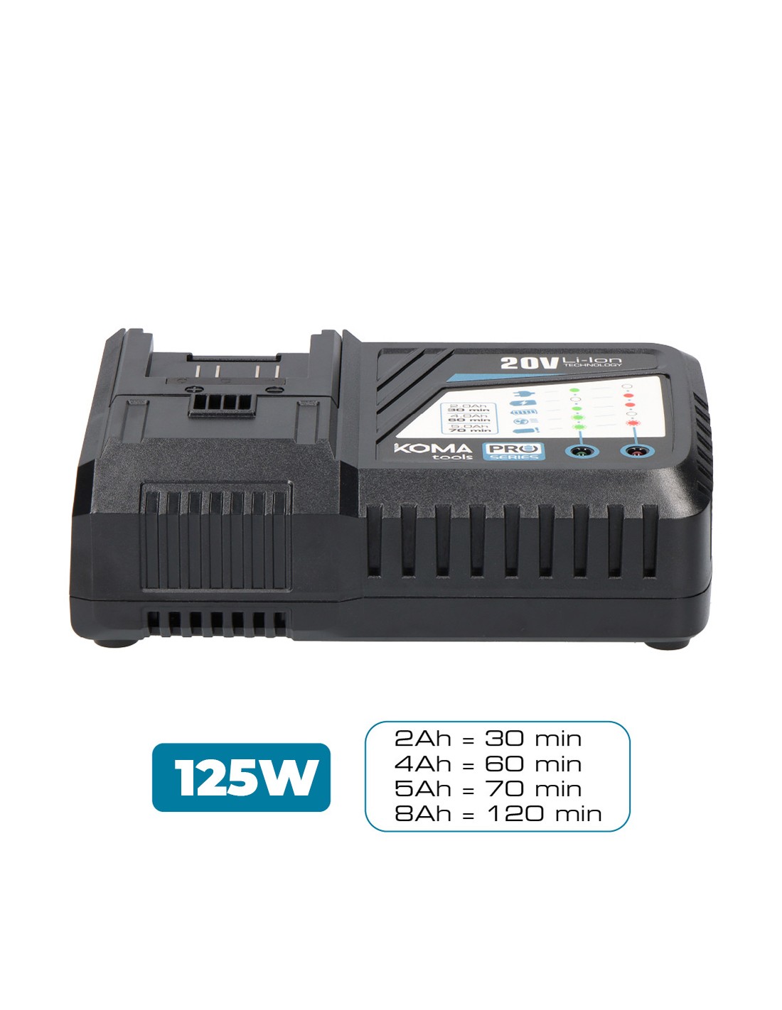 Cargador rapido de bateria 20 v 125 w 2,3 a- 5a voltaje: 100-240 v~ 50/60 hz. con indicador de carga tiempo de carga bateria de 2.0 ah 30 min bateria de 4.0 ah 60 min bateria de 5.0 75 min bateria 8.0 ah 120 min 20v-cb125. 125 x 180 x 60 mm