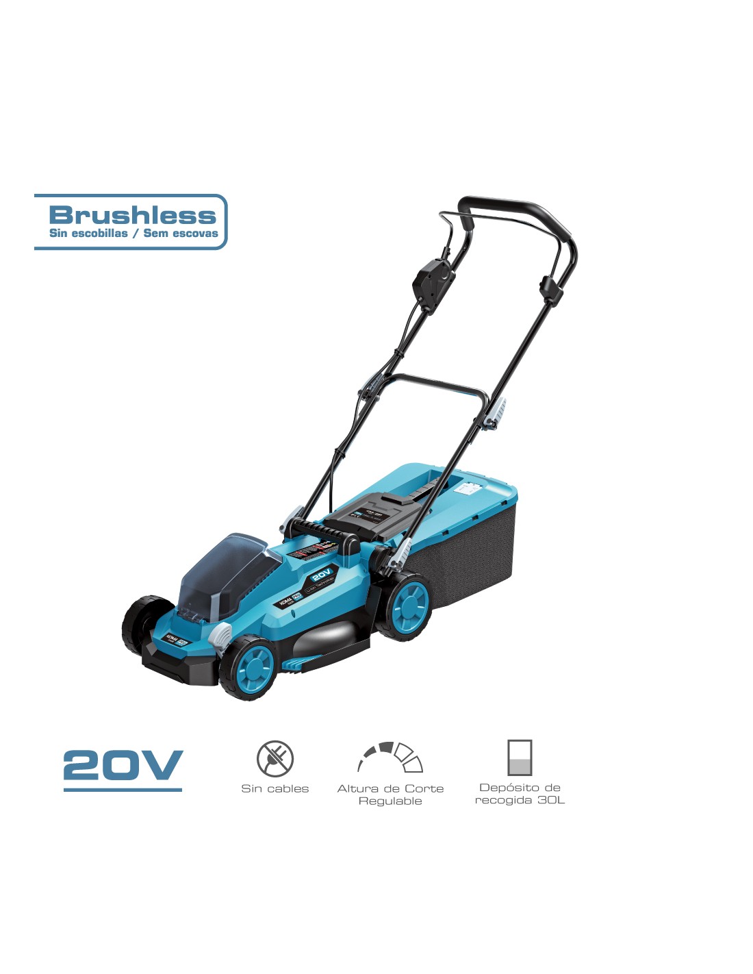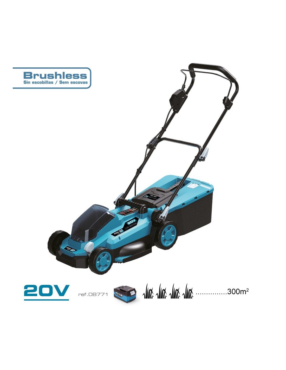 Cortacésped. potencia: 20v (sin batería ni cargador). velocidad sin carga 2900rpm. máximo ancho de corte 330mm. altura de corte regulable 25-75mm. hasta 5 niveles. recogedor de hierba 30l. utilizar solo bateria ref 08771. decibelios: 96db. 20v-cc. dimensiones: 97 x 93 cm
