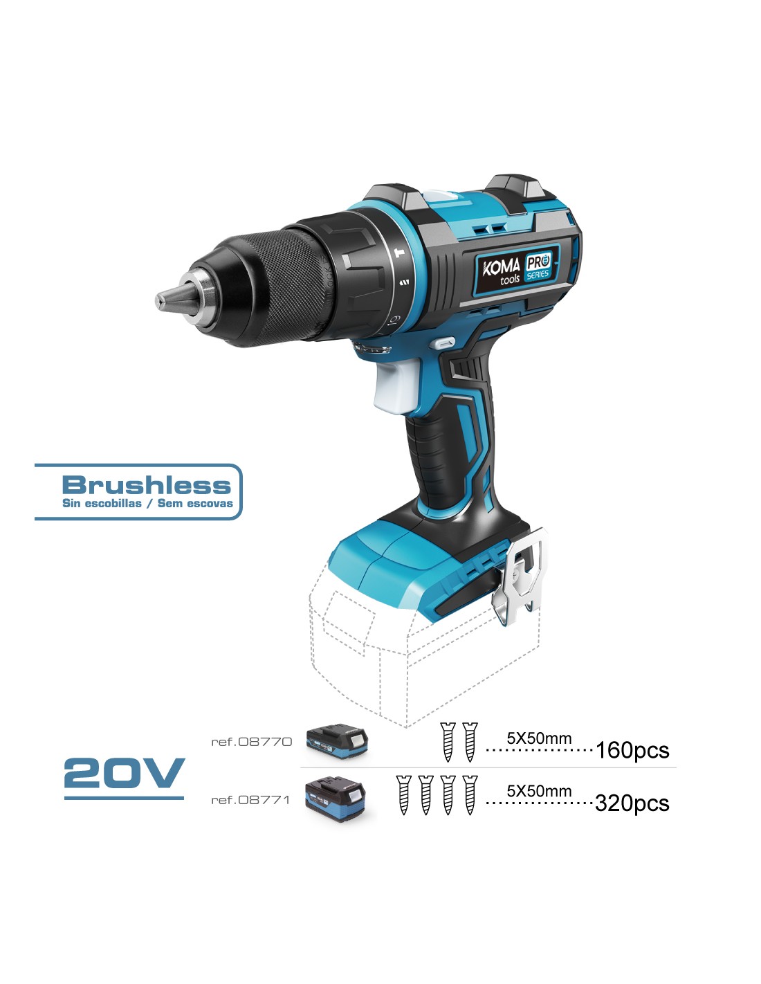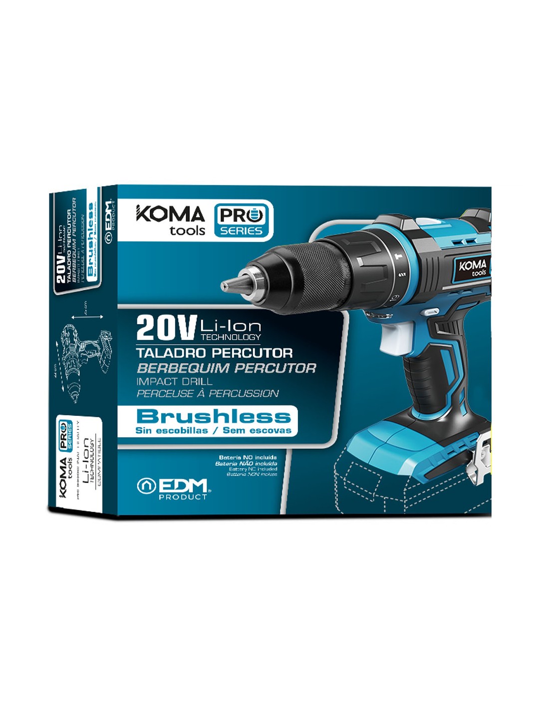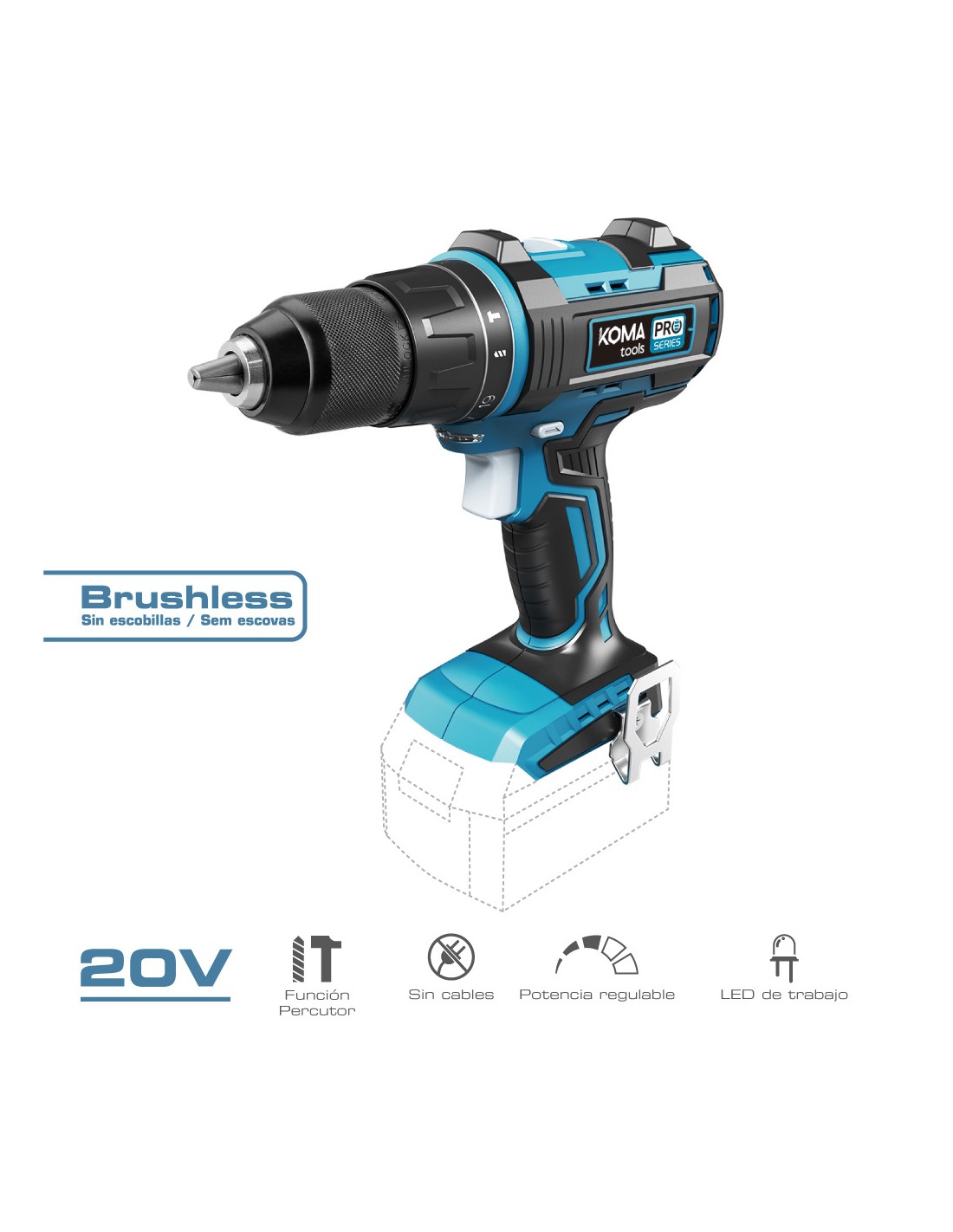 Taladro percutor/atornillador de bateria li-ion brushless (sin escobillas) portabrocas ø13mm. no incluye bateria ni cargador. 2 velocidades variables (velocidad 1: de 0 a 500 rpm. velocidad 2: de 0 a 1800rpm). rotación izquierda/derecha. portabrocas sin llave de ø13mm. luz led para iluminar el punto de trabajo. soporte para colgar en el cinturon. 19 posiciones de apriete ajustable (max.50nm) + 1 posicion de taladro + 1 percutor. 20v-tapb, dimensiones: 22 x 25 cm