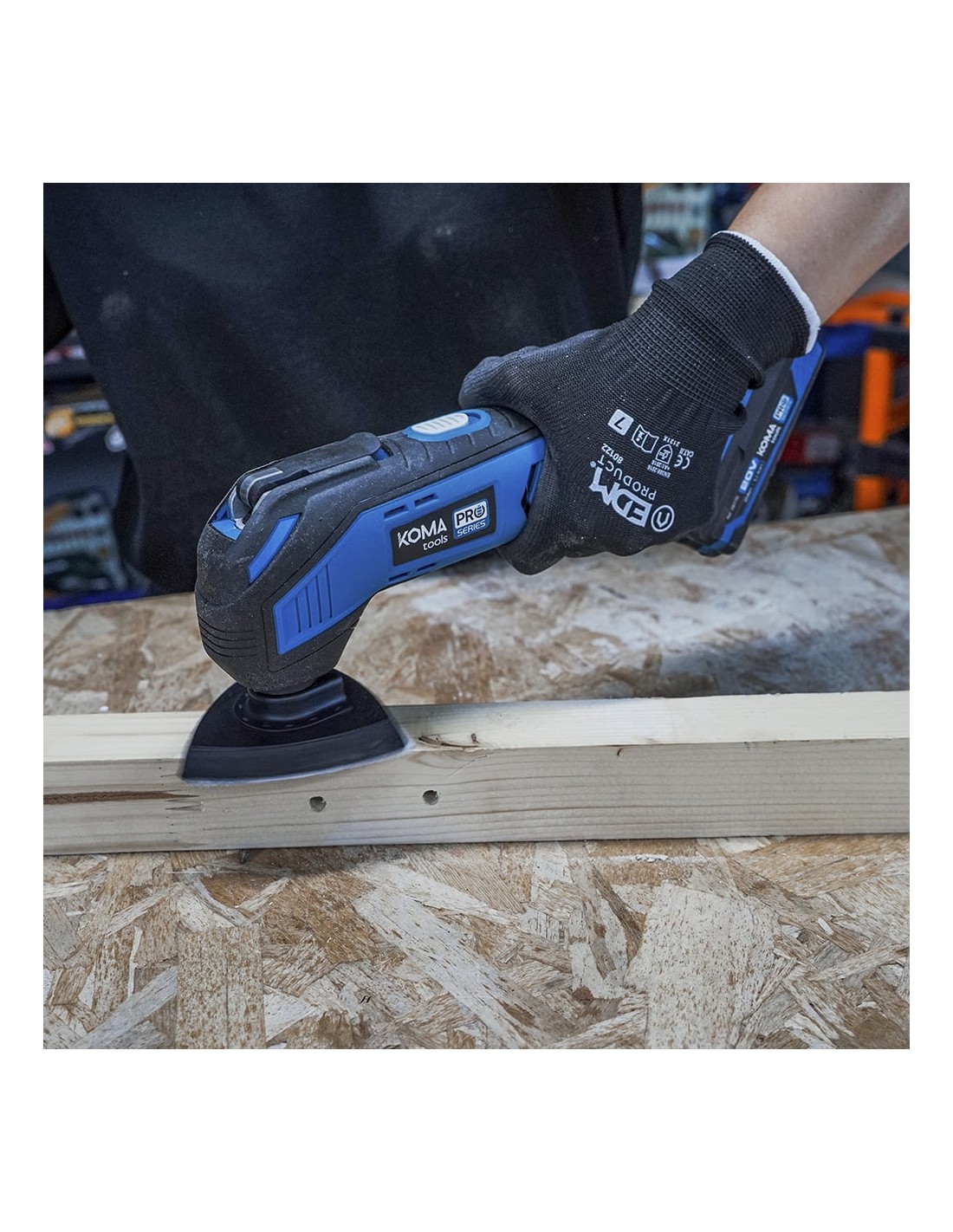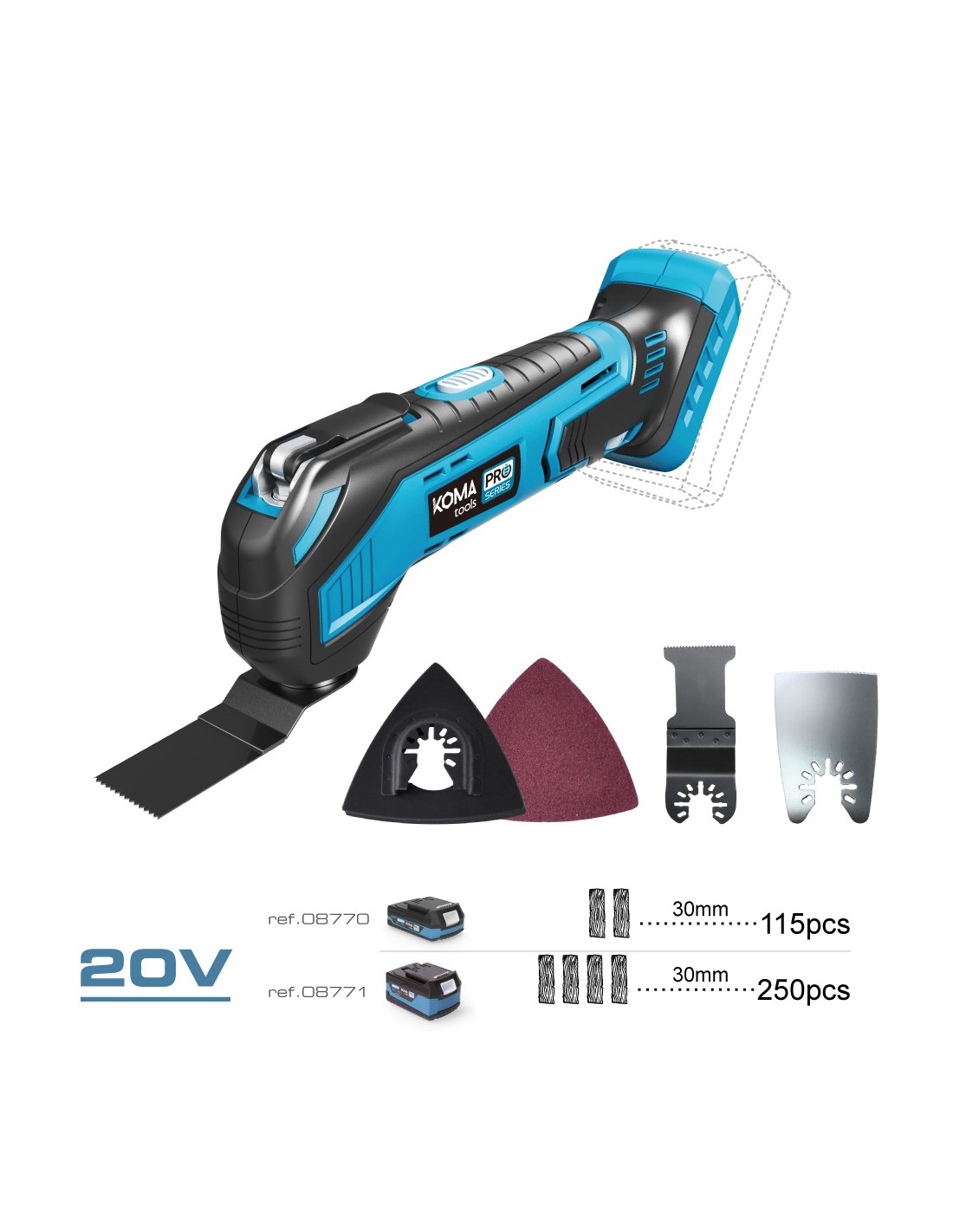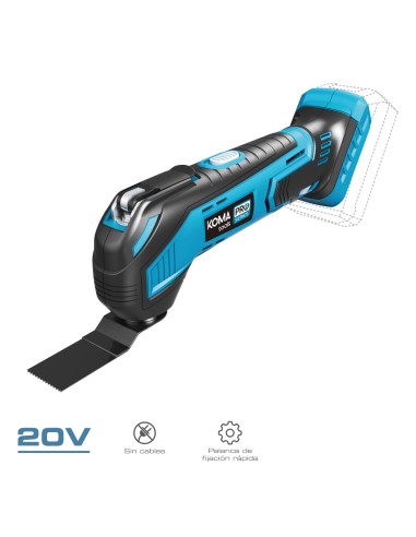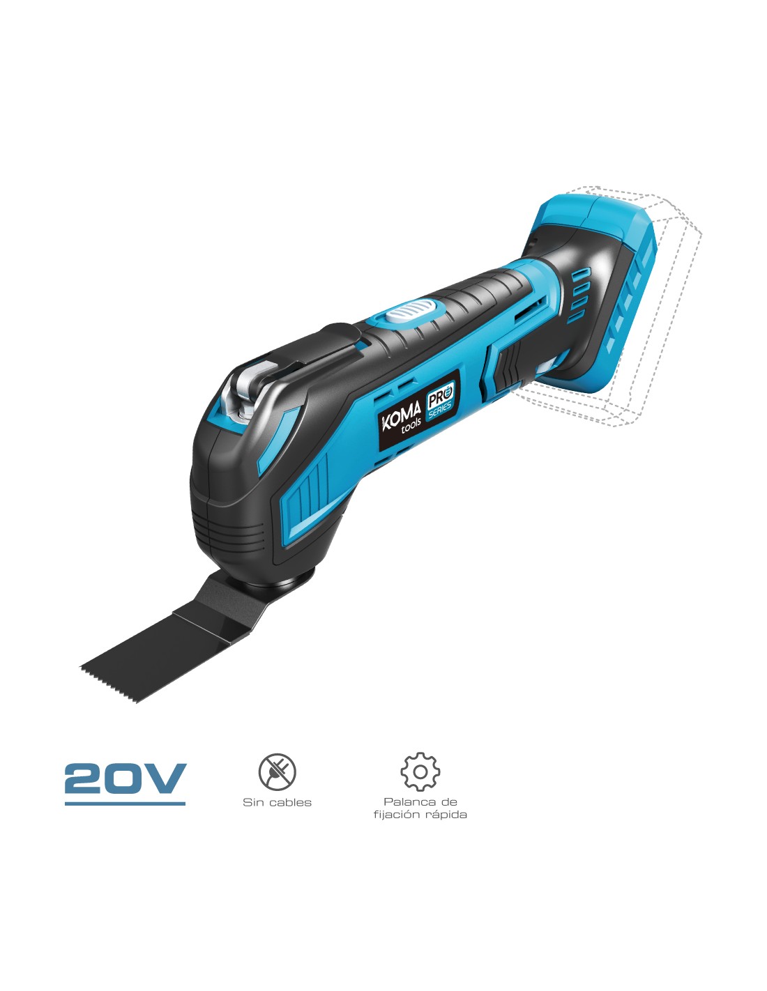 Multiherramienta 20 v li-ion (no incluye bateria y cargador). velocidad variable de 11.000 a 21.000 rpm. ángulo de oscilación de 3,2°. sistema de cambio de cuchilla de liberacion rapida. accesorios: 1 almohadilla de lijado + 1 hoja de lija + 1 raspador + 1 sierra. 20v-mh. dimensiones: 31,3 x 11 cm