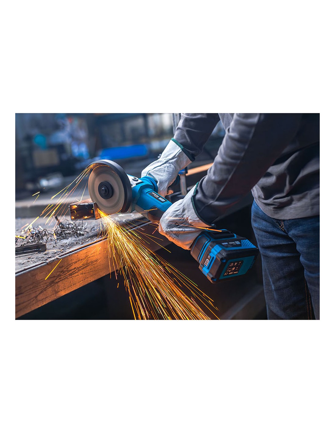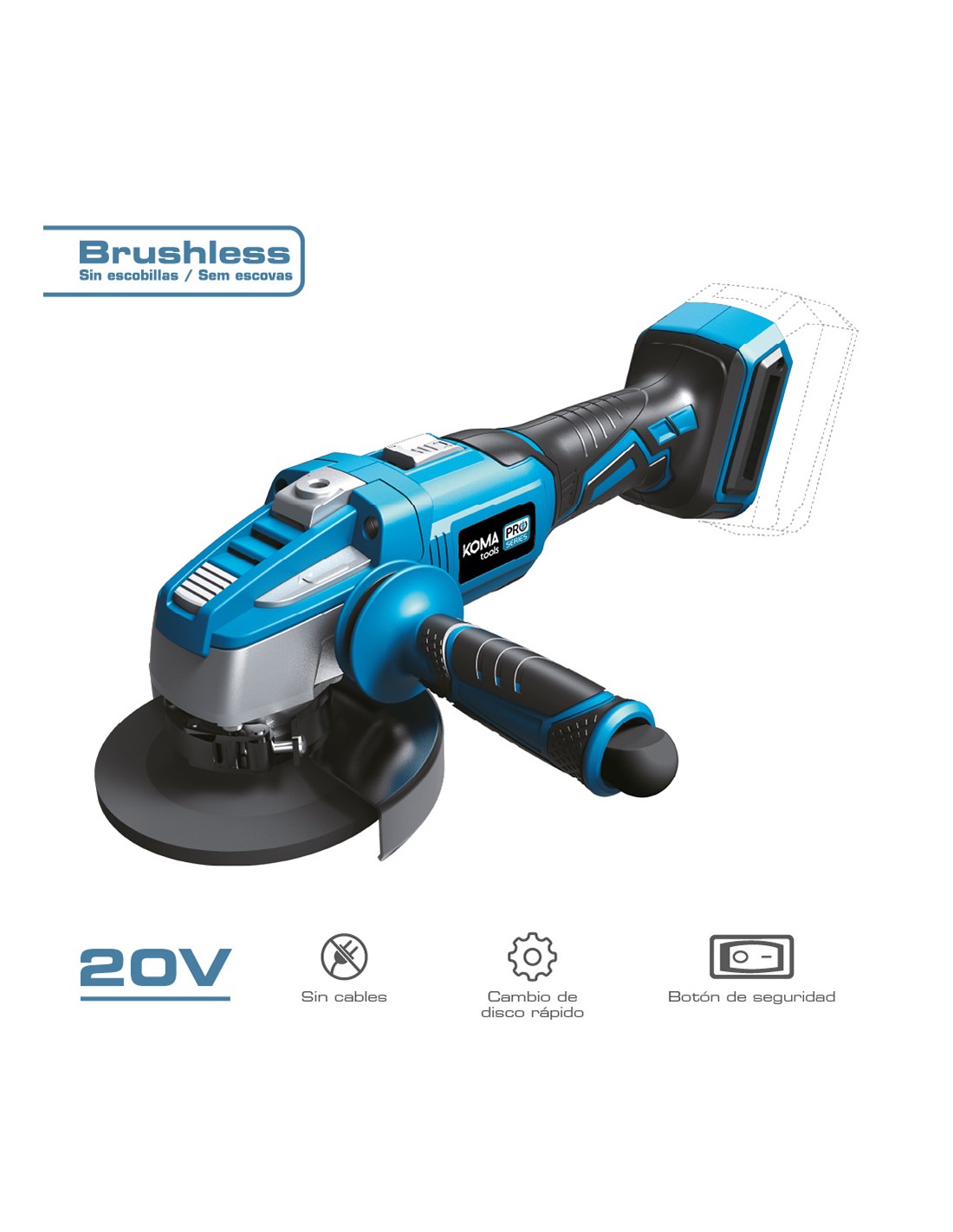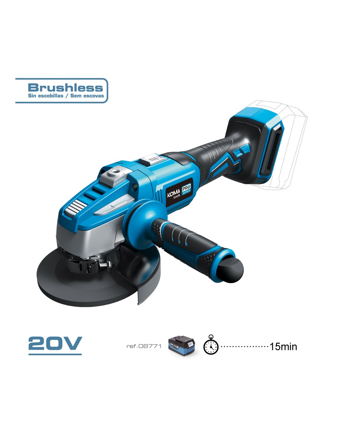 Amoladora potencia: 20 v li-ion brushless (sin escobillas). no incluye bateria y cargador. 8500rpm. protector para disco de ø125mm (disco no incluido). interruptor de seguridad. para un funcionamiento optimo de este artículo se aconseja utilizar una batería ref. 08771 accesorios: mango adicional + 1 llave para cambiar el disco. 20v-amb, dimensiones: 37,5 x 12 cm