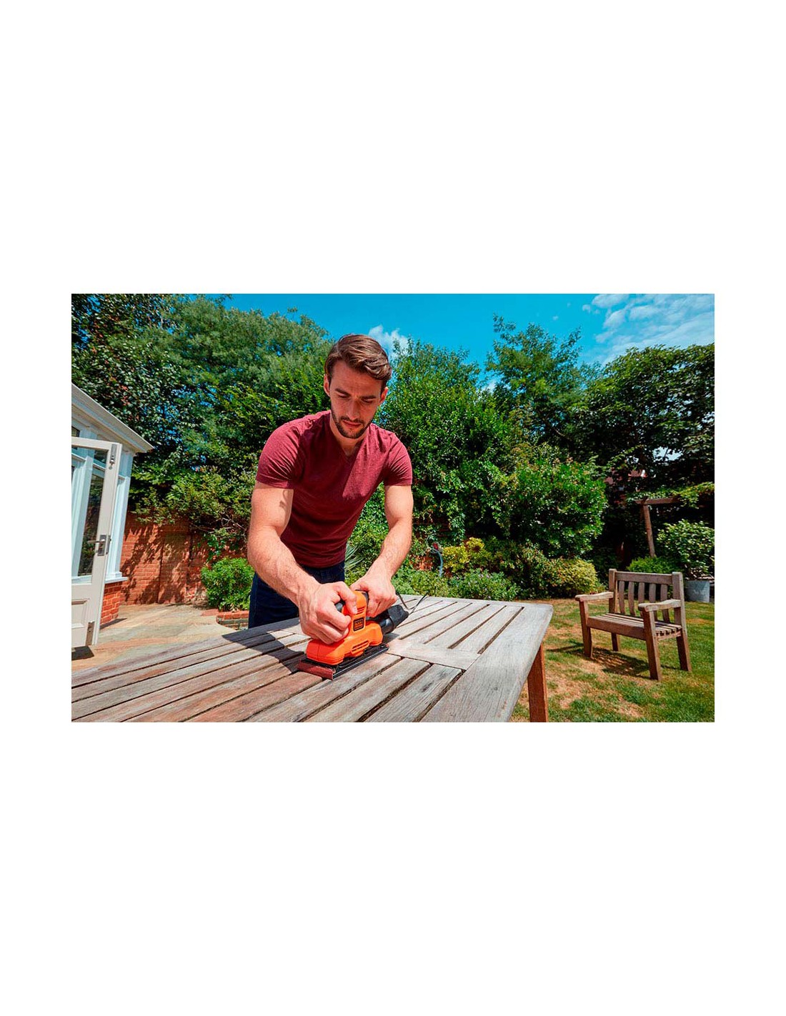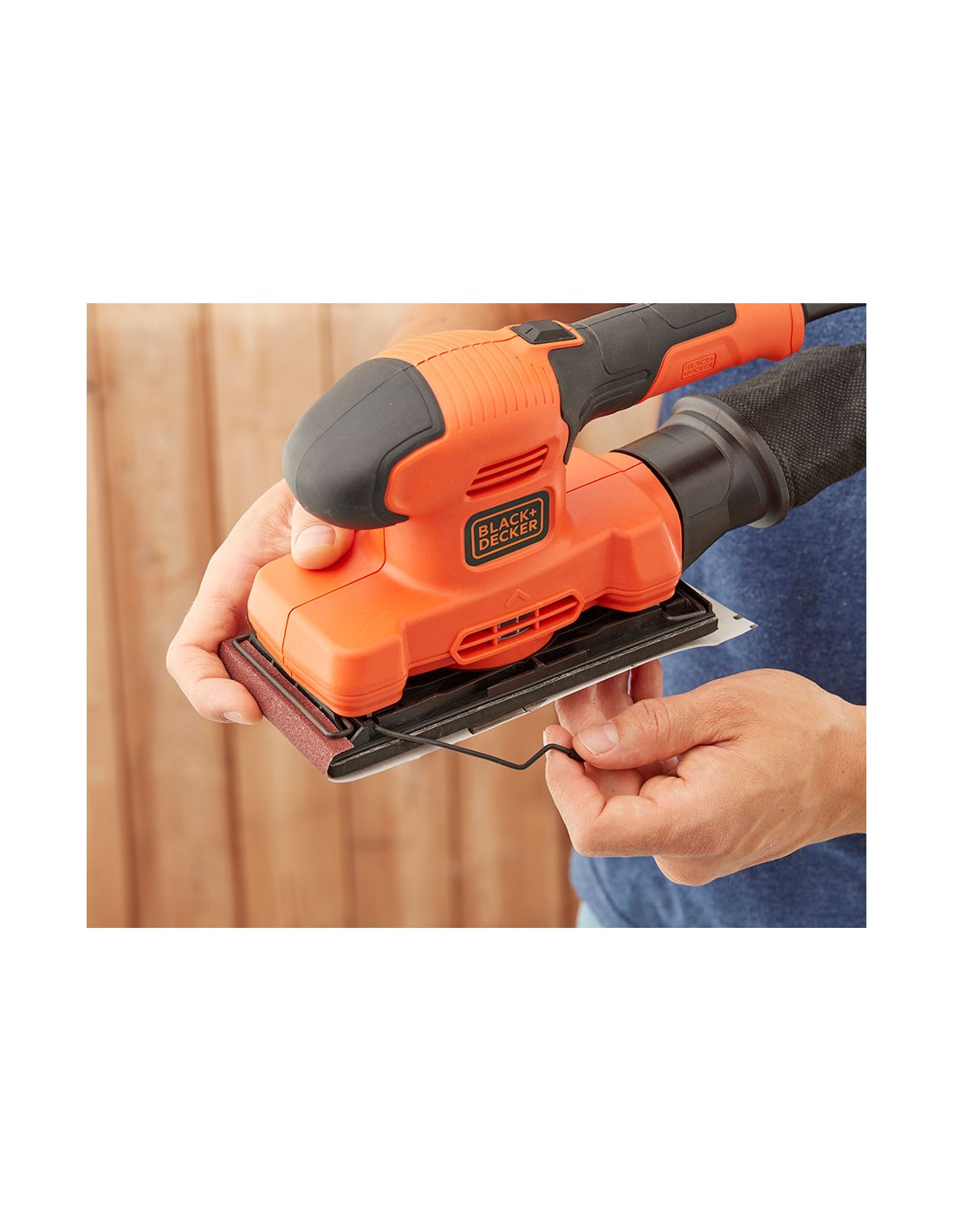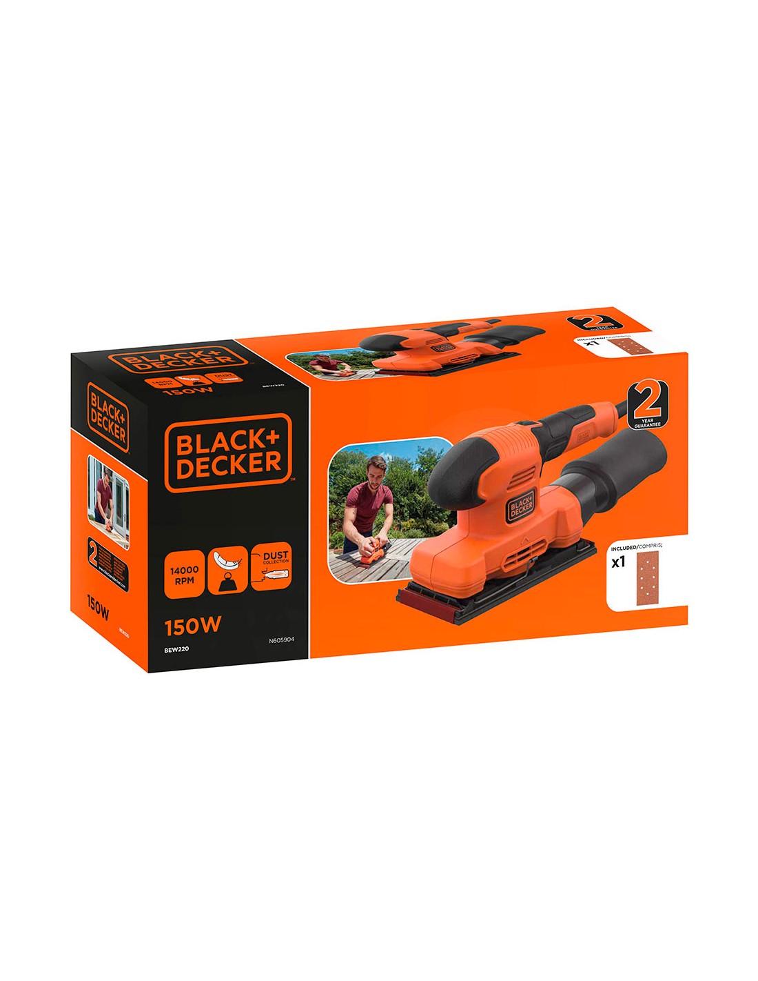 Lijadora orbital 150w de 1/3 bew220-qs black+decker. velocidad 14.000rpm, órbita 2mm, hoja 230x92mm. incluye 1 hoja de lija. nivel de potencia sonora: 85db. incluye polsa de recogida de polvo. es perfecta para tareas de lijado en grandes superficies. cable de 2m. 230v