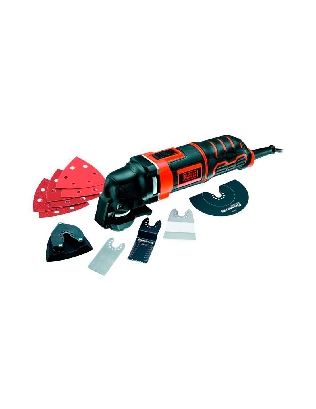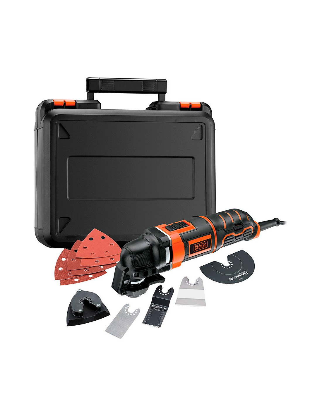 Multi-herramienta oscilante 300w mt300ka-qs black+decker. velocidad variable 10.000-22.000rpm, ángulo oscilación 1,4°/2,8°. adaptador para utilizar accesorios de otras marcas. incluye 12 accesorios para cortar, rascar y lijar. vibracion: 10,3m/s. 90db. maletín de transporte. con cable de 3m. 230v